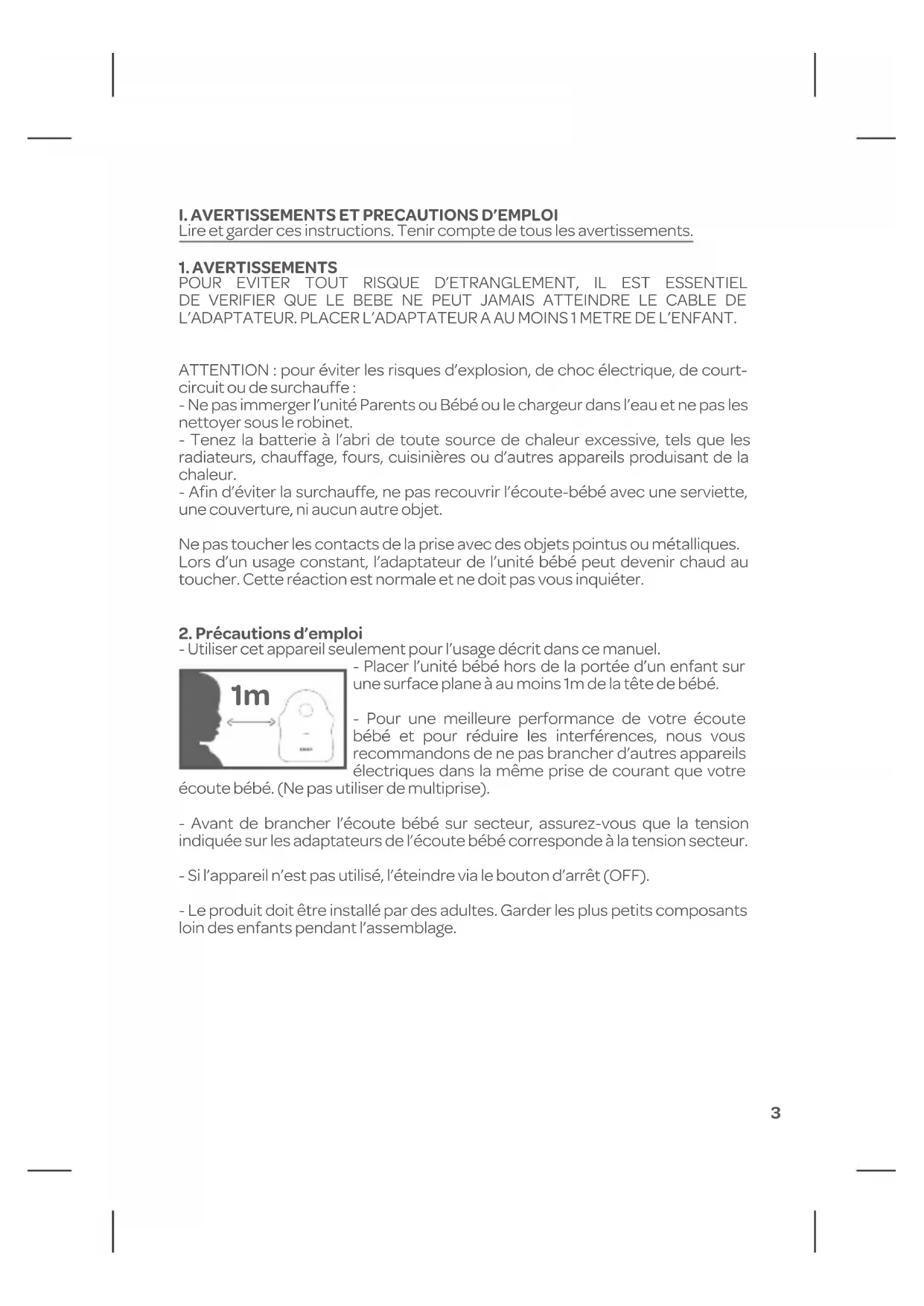 POUR EVITER TOUT RISQUE D’ETRANGLEMENT, IL EST ESSENTIEL DE VERIFIER QUE LE BEBE NE PEUT JAMAIS ATTEINDRE LE CABLE DE L’ADAPTATEUR. PLACER L’ADAPTATEUR A AU MOINS 1 METRE DE L’ENFANT. ATTENTION : pour éviter les risques d’explosion, de choc électrique, de court- circuit ou de surchauffe : - Ne pas immerger l’unité Parents ou Bébé ou le chargeur dans l’eau et ne pas les nettoyer sous le robinet. - Tenez la batterie à l’abri de toute source de chaleur excessive, tels que les radiateurs, chauffage, fours, cuisinières ou d’autres appareils produisant de la chaleur. - Afin d’éviter la surchauffe, ne pas recouvrir l’écoute-bébé avec une serviette, une couverture, ni aucun autre objet. Ne pas toucher les contacts de la prise avec des objets pointus ou métalliques. Lors d’un usage constant, l’adaptateur de l’unité bébé peut devenir chaud au toucher. Cette réaction est normale et ne doit pas vous inquiéter.