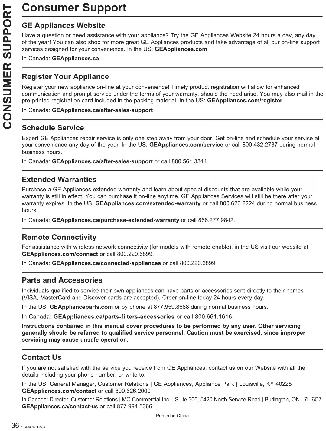 Soutien au consommateur Site Web de GE Appliances Vous avez une question ou vous avez besoin d’aide pour votre appareil électroménager? Visitez le site Web de GE Appliances 24 heures par jour, tous les jours de l’année! Vous pouvez aussi y trouver d’autres formidables produits GE Appliances et tirer avantage de tous nos services d’assistance en ligne. Au Canada : ElectromenagersGE.ca/fr Enregistrez votre électroménager Enregistrez votre nouvel appareil en ligne au moment qui vous convient le mieux! L’enregistrement de votre produit dans les délais prescrits permet une meilleure communication et un service rapide, selon les modalités de votre garantie, si besoin est. Vous pouvez également envoyer par courrier la carte d’enregistrement pré-imprimée qui se trouve dans l’emballage de votre appareil. Au Canada : electromenagersge.ca/soutien-apres-vente Service de réparation Un service de réparation expert GE Appliances se trouve à quelques pas de chez vous. Rendez-vous sur notre site et programmez, à votre convenance, une visite de réparation à n’importe quel jour de l’année. Au Canada : electromenagersge.ca/soutien-apres-vente ou composez le 800.561.3344 Prolongation de garantie Procurez-vous une prolongation de garantie GE Appliances et informez-vous des rabais spéciaux en vigueur pendant la durée de votre garantie. Vous pouvez vous la procurer en ligne en tout temps. Les services GE Appliances seront toujours disponibles après l’expiration de la garantie. Au Canada : electromenagersge.ca/achat-dune-garantie-prolongee ou composez le 866.277.9842. Connectivité à distance Pour de l’assistance concernant la connectivité au réseau sans fil (pour les modèles équipés de cette fonction), visitez notre site Web au electromenagersge.ca/connected-appliances ou composez le 800.220.6899. Pièces et accessoires Les personnes ayant les compétences requises pour réparer elles-mêmes leurs appareils peuvent recevoir directement à la maison des pièces ou accessoires (les cartes VISA, MasterCard et Discover sont acceptées). Commandez en ligne 24 heures par jour. Au Canada : electromenagersge.ca/pieces-filtres-et-accessoires ou composer le 800.661.1616. Les instructions contenues dans le présent manuel comportent des procédures que tout utilisateur peut effectuer. Les autres types de réparation doivent généralement être confiés à un technicien qualifié. Usez de prudence : une réparation ou un entretien mal effectués peuvent rendre l’utilisation de l’appareil dangereuse. Communiquez avec nous Si vous n’êtes pas satisfait du service après-vente de GE Appliances, communiquez avec nous depuis notre site Web en fournissant tous les détails dont votre numéro de téléphone, ou écrivez à : Au Canada : Director, Customer Relations
