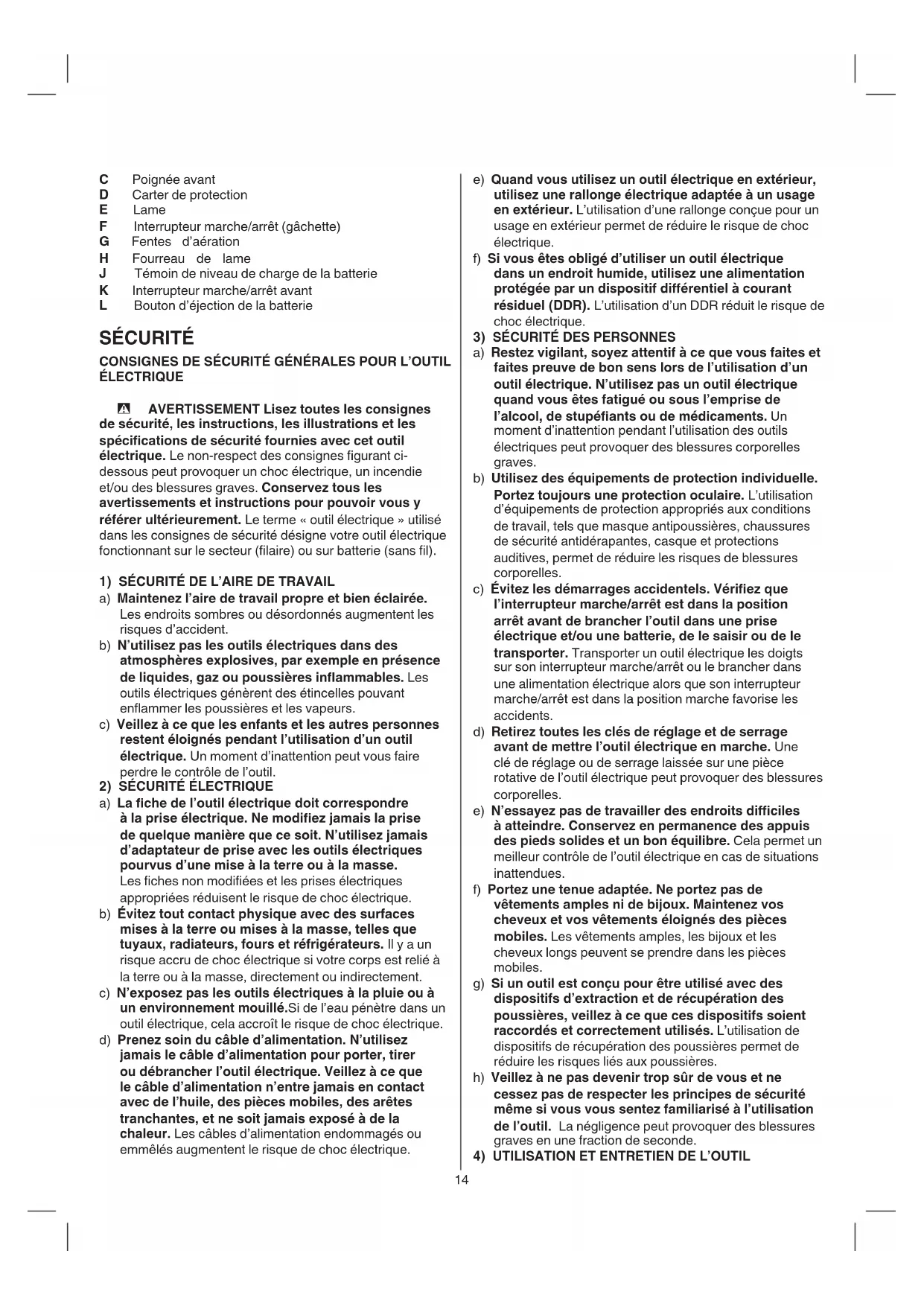 J Témoin de niveau de charge de la batterie K Interrupteur marche/arrêt avant L Bouton d’éjection de la batterie SÉCURITÉ CONSIGNES DE SÉCURITÉ GÉNÉRALES POUR L’OUTIL ÉLECTRIQUE - AVERTISSEMENT Lisez toutes les consignes de sécurité, les instructions, les illustrations et les spécications de sécurité fournies avec cet outil électrique. Le non-respect des consignes gurant ci- dessous peut provoquer un choc électrique, un incendie et/ou des blessures graves. Conservez tous les avertissements et instructions pour pouvoir vous y référer ultérieurement. Le terme « outil électrique » utilisé dans les consignes de sécurité désigne votre outil électrique fonctionnant sur le secteur (laire) ou sur batterie (sans l).