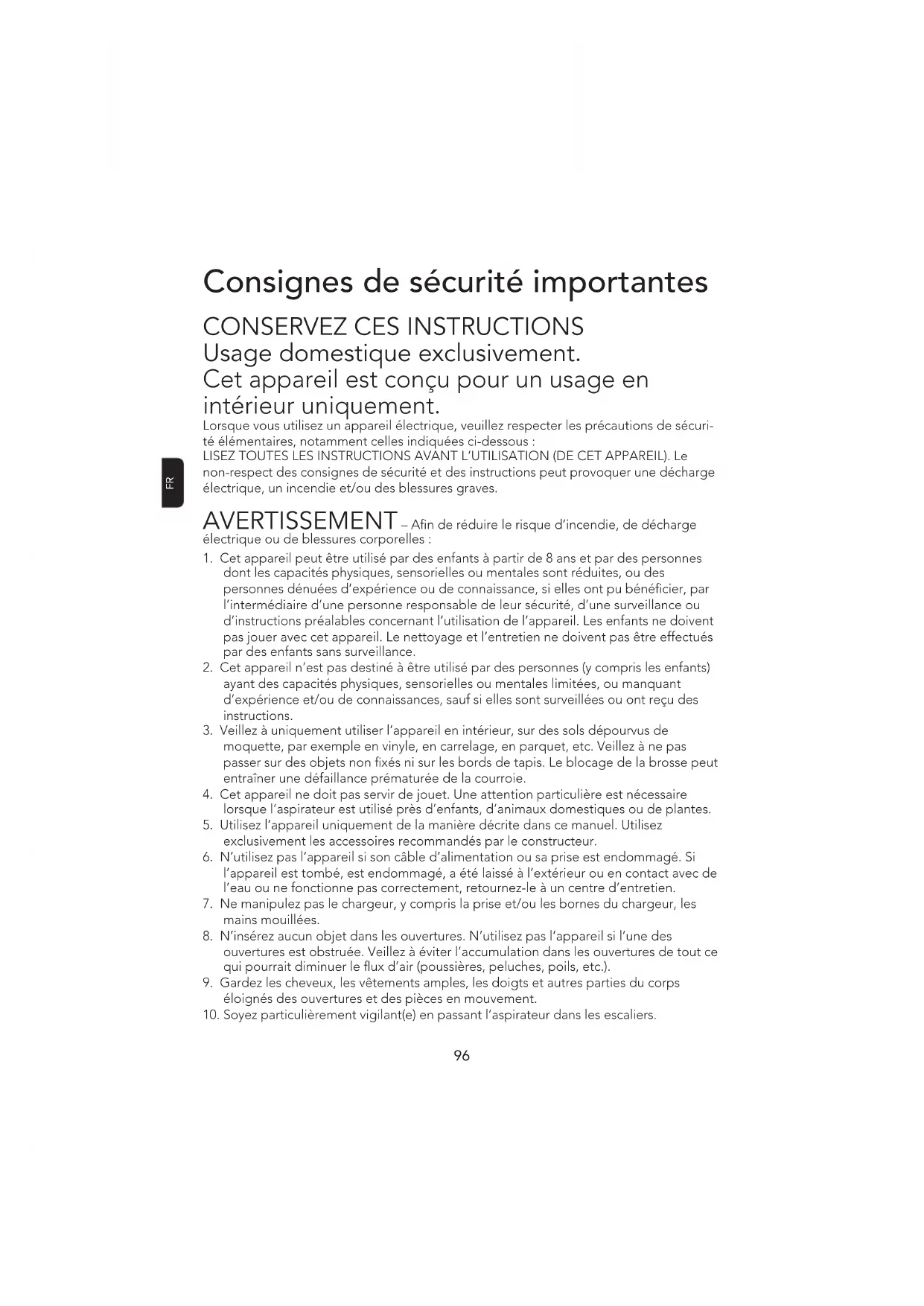 Usage domestique exclusivement. Cet appareil est conçu pour un usage en intérieur uniquement. Lorsque vous utilisez un appareil électrique, veuillez respecter les précautions de sécuri- té élémentaires, notamment celles indiquées ci-dessous: LISEZ TOUTES LES INSTRUCTIONS AVANT L’UTILISATION (DE CET APPAREIL). Le non-respect des consignes de sécurité et des instructions peut provoquer une décharge électrique, un incendie et/ou des blessures graves. AVERTISSEMENT – An de réduire le risque d’incendie, de décharge électrique ou de blessures corporelles: