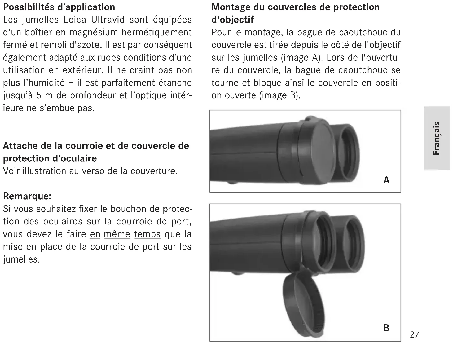 Ne jamais regarder dans les jumelles en marchant! Vous ne pourriez pas voir les obstacles!Français Possibilités d’application Les jumelles Leica Ultravid sont équipées d'un boîtier en magnésium hermétiquement fermé et rempli d'azote. Il est par conséquent également adapté aux rudes conditions d’une utilisation en extérieur. Il ne craint pas non plus l’humidité – il est parfaitement étanche jusqu’à 5 m de profondeur et l’optique intér- ieure ne s’embue pas. Attache de la courroie et de couvercle de protection d'oculaire Voir illustration au verso de la couverture. Remarque: Si vous souhaitez fixer le bouchon de protec- tion des oculaires sur la courroie de port, vous devez le faire en même temps que la mise en place de la courroie de port sur les jumelles. Montage du couvercles de protection d'objectif Pour le montage, la bague de caoutchouc du couvercle est tirée depuis le côté de l'objectif sur les jumelles (image A). Lors de l'ouvertu- re du couvercle, la bague de caoutchouc se tourne et bloque ainsi le couvercle en positi- on ouverte (image B).