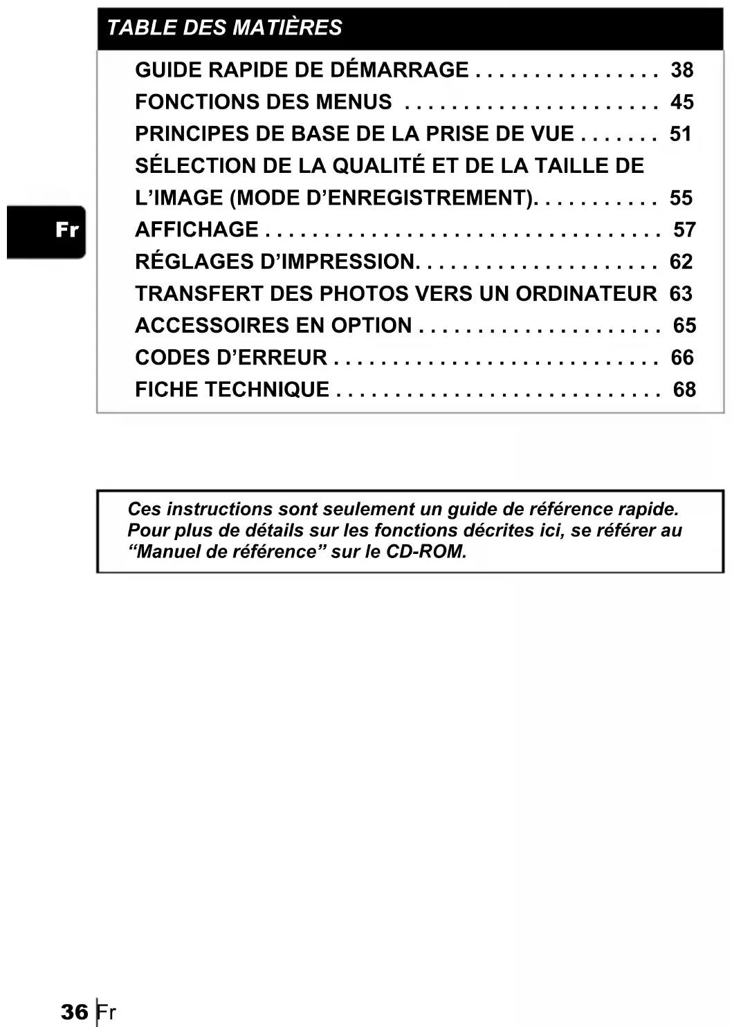 FICHE TECHNIQUE . . . . . . . . . . . . . . . . . . . . . . . . . . . . 68 Ces instructions sont seulement un guide de référence rapide. Pour plus de détails sur les fonctions décrites ici, se référer au “Manuel de référence” sur le CD-ROM. basic_f.fm Page 36 Thursday, February 7, 2002 2:10 PMFr 37