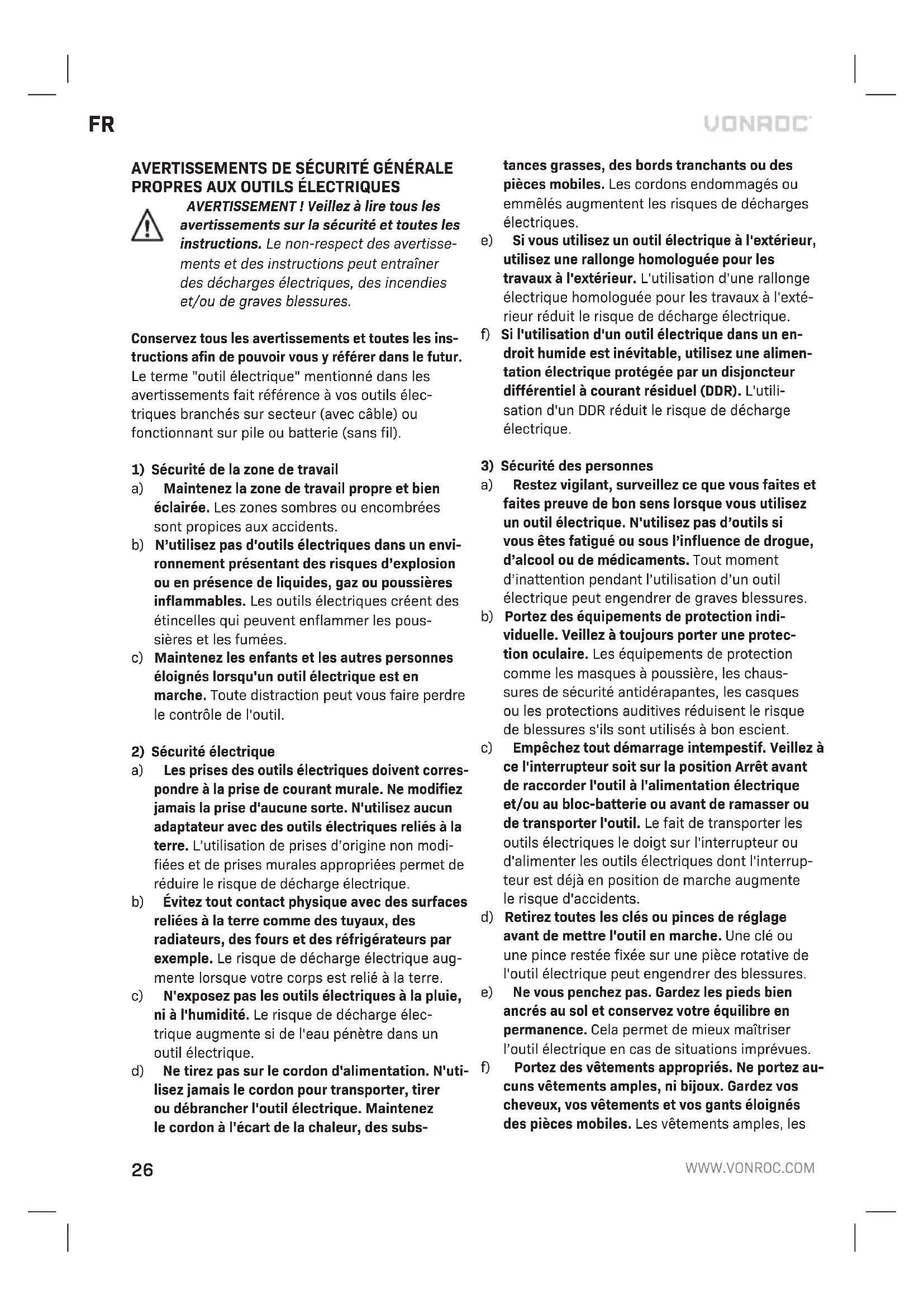 Avant toute opération de nettoyage ou de maintenance, éteignez toujours la machine et retirez-en le bloc-batterie. Nettoyez régulièrement le boîtier de la machine à l'aide d'un chiffon doux et de préférence après chaque utilisation. Veillez à ce que les ouvertures de ventilation restent exemptes de poussière et de saletés. Supprimez les taches te- naces à l'aide d'un chiffon doux légèrement humide et d'une solution savonneuse. N'utilisez aucun solvant comme de l'essence, de l'alcool, de l'am- moniaque, etc. car ces produits chimiques peuvent endommager les composants synthétiques. ENVIRONNEMENT Les appareils électriques et électroniques défectueux ou en fin de vie doivent être rapportés dans des sites de recyclage appropriés. Pour les pays de la Communauté Européenne uniquement Ne jetez pas les outils électriques avec les déchets ménagers. Conformément à la Directive Euro- péenne 2012/19/CE relative à l'élimination des déchets électriques et électroniques et sa trans- position dans la législation nationale, les outils électriques inutilisables doivent être collectés séparément et être jetés de façon écologique. GARANTIE Les produits VONROC sont développés avec les normes de qualité les plus hautes et ils sont garantis pour être exempts de défaut de pièces et de main d'œuvre pour la durée stipulée par la loi et à compter de la date d'achat initiale. Si, au cours de cette période, le produit devait rencontrer une quelconque panne due à un défaut de pièce ou de main d'œuvre, contactez VONROC directement. Les conditions suivantes sont exclues de la garantie :