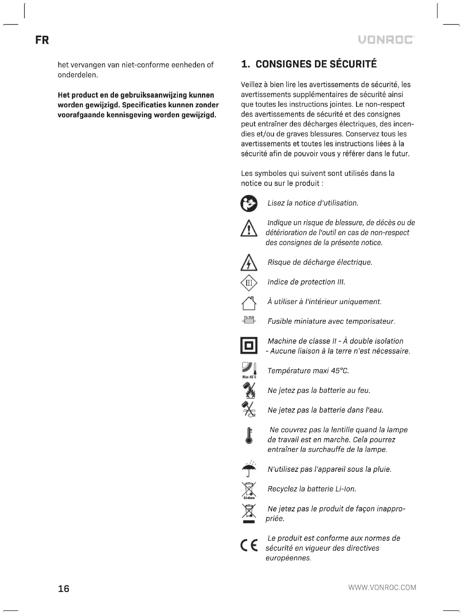 Nettoyage Nettoyez régulièrement l'extérieur de la machine àl'aide d'un chiffon doux et de préférence après chaque utilisation. Supprimez les taches tenaces àl'aide d'un chiffon doux légèrement humide et d'une solution savonneuse. N'utilisez aucun solvant comme de l'essence, de l'alcool, de l'ammoniaque, etc. car ces produits chimiques peuvent endommager les composants synthétiques de la lampe de travail. ENVIRONNEMENT Les appareils électriques et électroniques défectueux ou en fin de vie doivent être rapportés dans des sites de recyclage appropriés. Pour les pays de la Communauté Européenne uniquement Ne jetez pas les outils électriques avec les déchets ménagers. Conformément àla Directive Européenne 2012/19/UE relative àl'élimination des déchets élec- triques et électroniques et àsa transposition dans la législation nationale, les outils électriques usagés doivent être collectés séparément et être jetés de façon écologique. GARANTIE Les produits VONROC sont développés avec les normes de qualité les plus hautes et ils sont garantis pour être exempts de défaut de pièces et de main d'œuvre pour la durée stipulée par la loi et àcompter de la date d'achat initiale. Si, au cours de cette période, le produit devait rencontrer une quelconque panne due àun défaut de pièce ou de main d'œuvre, contactez VONROC directement. Les conditions suivantes sont exclues de la garantie :