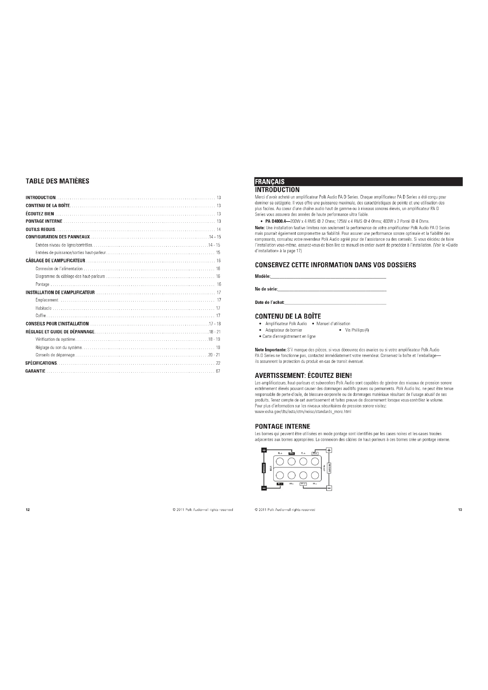 Symptôme Cause probable Solution22 © 2011 Polk Audio—all rights reserved © 2011 Polk Audio—all rights reserved 23 Amplificateur PA D4000.4 Type Pontable Classe D MOSFET Canaux 4 canaux Puissance RMS continue @ 4 Ohms 125 W x 4 Puissance RMS continue @ 2 Ohms 200 W x 4 Puissance pontée @ 4 Ohms 400 W x 2 Distorsion à puissance nom. <0.1% Impédance minimum pontée 4 Ohms Impédance minimum non pontée 2 Ohms Rapport signal/bruit 105 dB Réponse en fréquences 20 Hz - 20 kHz Facteur d’amortissement >100 Pente du séparateur (dB/octave) 12 dB/octave Filtre commutateur (avant) 3-positions (HPF, Full, BPF) Filtre passe-haut Gamme de fréquences (av.) 20 Hz - 4 kHz Filtre passe-bas Gamme de fréquences (av.) 50 Hz - 5 kHz Contrôle de gain (avant) 200mV-6V Amplificateur PA D4000.4 Filtrecommutateur(arrière) 3-positions (HPF, Full, BPF) Filtre passe-haut Gamme de fréquences (arr.) 20Hz - 4kHz Gamme de fréquences (arr.) Filtre passe-bas 50Hz - 5kHz Contrôledegainarrière 200mV-6V Entrées niveau ligne (o/n) Oui Sorties niveau ligne (o/n) Non VoyantDELPower Oui VoyantDELProtection Oui Voltaged’alimentation 10V-16V Fusible-alimentation/Type (1) 40A (1) 35A ATC Connexions d’alimentation 4 AWG Connexions de masse 4 AWG Connexions haut-parleurs 12 AWG Hauteur 113/16"(46mm) Profondeur 63/4"(171.5mm) Largeur 1015/16"(277.8mm) Largeur avec adaptateur de bornier 1111/16"(296.9mm) Poids 5 lb (2.7 kg) SPÉCIFICATIONS ÍNDICE INTRODUCCIÓN ............................................................................. 24 LO QUE HAY EN LA CAJA . . . . . . . . . . . . . . . . . . . . . . . . . . . . . . . . . . . . . . . . . . . . . . . . . . . . . . . . . . . . . . . . . . . . . 24