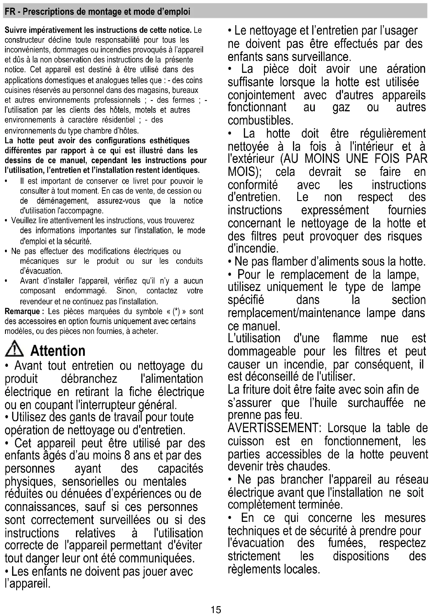 NUR bei einigen Produkten: Als optionales Zubehörteil wird eine Rückschlagklappe, die installiert werden kann, mitgeliefert. Wenn die Installationsbedingungen ihren Einbau notwendig machen (z. B. wenn kein Schutz gegen Zugluft, die von draußen hereindringt, vorhanden ist), setzen Sie die Rückschlagklappe in das Rohranschlussstück für den Luftausgang ein, bevor Sie den Rauchabzug installieren. Bild 1515 FR - Prescriptions de montage et mode d’emploi Suivre impérativement les instructions de cette notice. Le constructeur décline toute responsabilité pour tous les inconvénients, dommages ou incendies provoqués à l’appareil et dûs à la non observation des instructions de la présente notice. Cet appareil est destiné à être utilisé dans des applications domestiques et analogues telles que : - des coins cuisines réservés au personnel dans des magasins, bureaux et autres environnements professionnels ; - des fermes ; - l’utilisation par les clients des hôtels, motels et autres environnements à caractère résidentiel ; - des environnements du type chambre d’hôtes. La hotte peut avoir des configurations esthétiques différentes par rapport à ce qui est illustré dans les dessins de ce manuel, cependant les instructions pour l’utilisation, l’entretien et l’installation restent identiques.