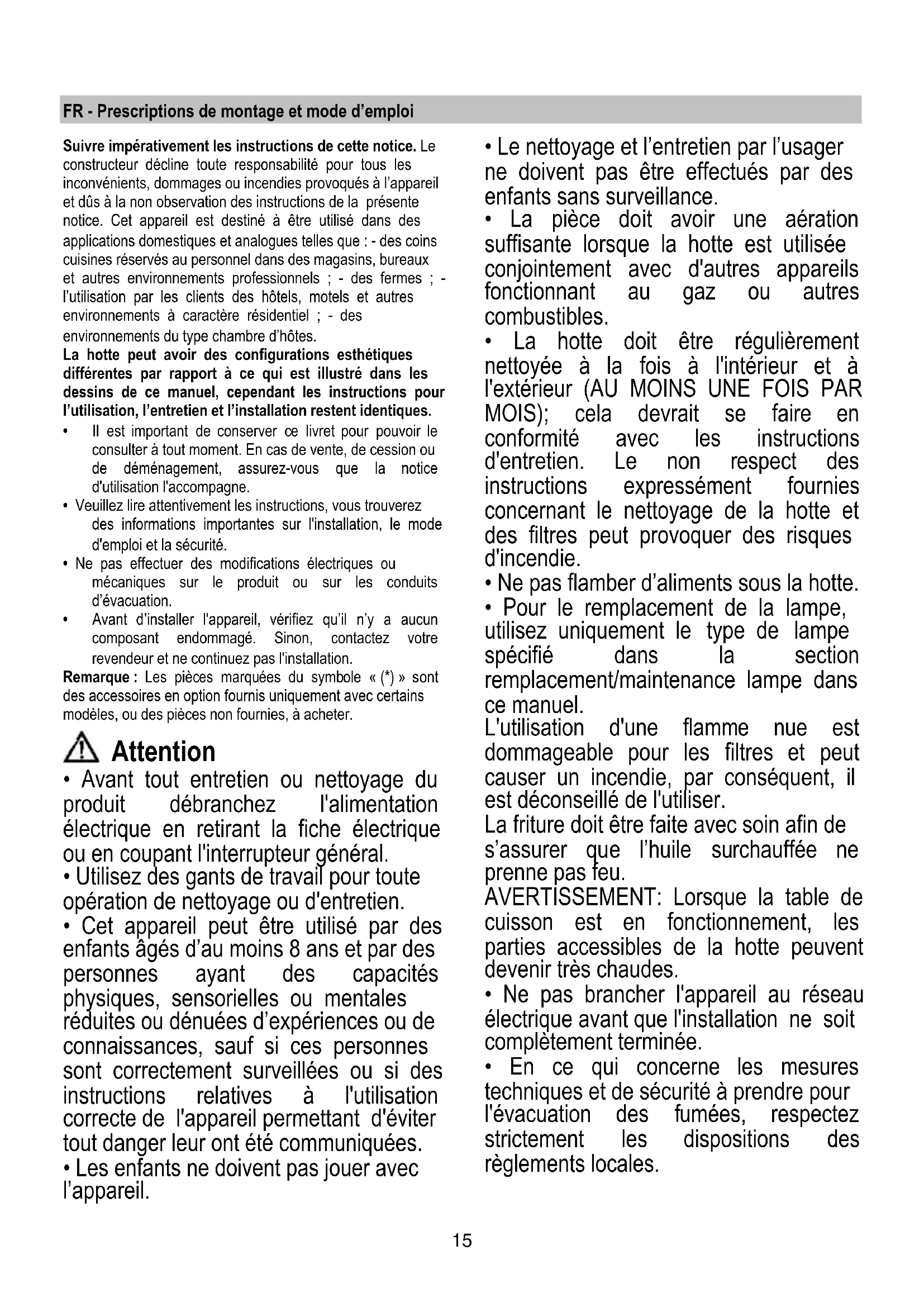 NUR bei einigen Produkten: Als optionales Zubehörteil wird eine Rückschlagklappe, die installiert werden kann, mitgeliefert. Wenn die Installationsbedingungen ihren Einbau notwendig machen (z. B. wenn kein Schutz gegen Zugluft, die von draußen hereindringt, vorhanden ist), setzen Sie die Rückschlagklappe in das Rohranschlussstück für den Luftausgang ein, bevor Sie den Rauchabzug installieren. Bild 1515 FR - Prescriptions de montage et mode d’emploi Suivre impérativement les instructions de cette notice. Le constructeur décline toute responsabilité pour tous les inconvénients, dommages ou incendies provoqués à l’appareil et dûs à la non observation des instructions de la présente notice. Cet appareil est destiné à être utilisé dans des applications domestiques et analogues telles que : - des coins cuisines réservés au personnel dans des magasins, bureaux et autres environnements professionnels ; - des fermes ; - l’utilisation par les clients des hôtels, motels et autres environnements à caractère résidentiel ; - des environnements du type chambre d’hôtes. La hotte peut avoir des configurations esthétiques différentes par rapport à ce qui est illustré dans les dessins de ce manuel, cependant les instructions pour l’utilisation, l’entretien et l’installation restent identiques.