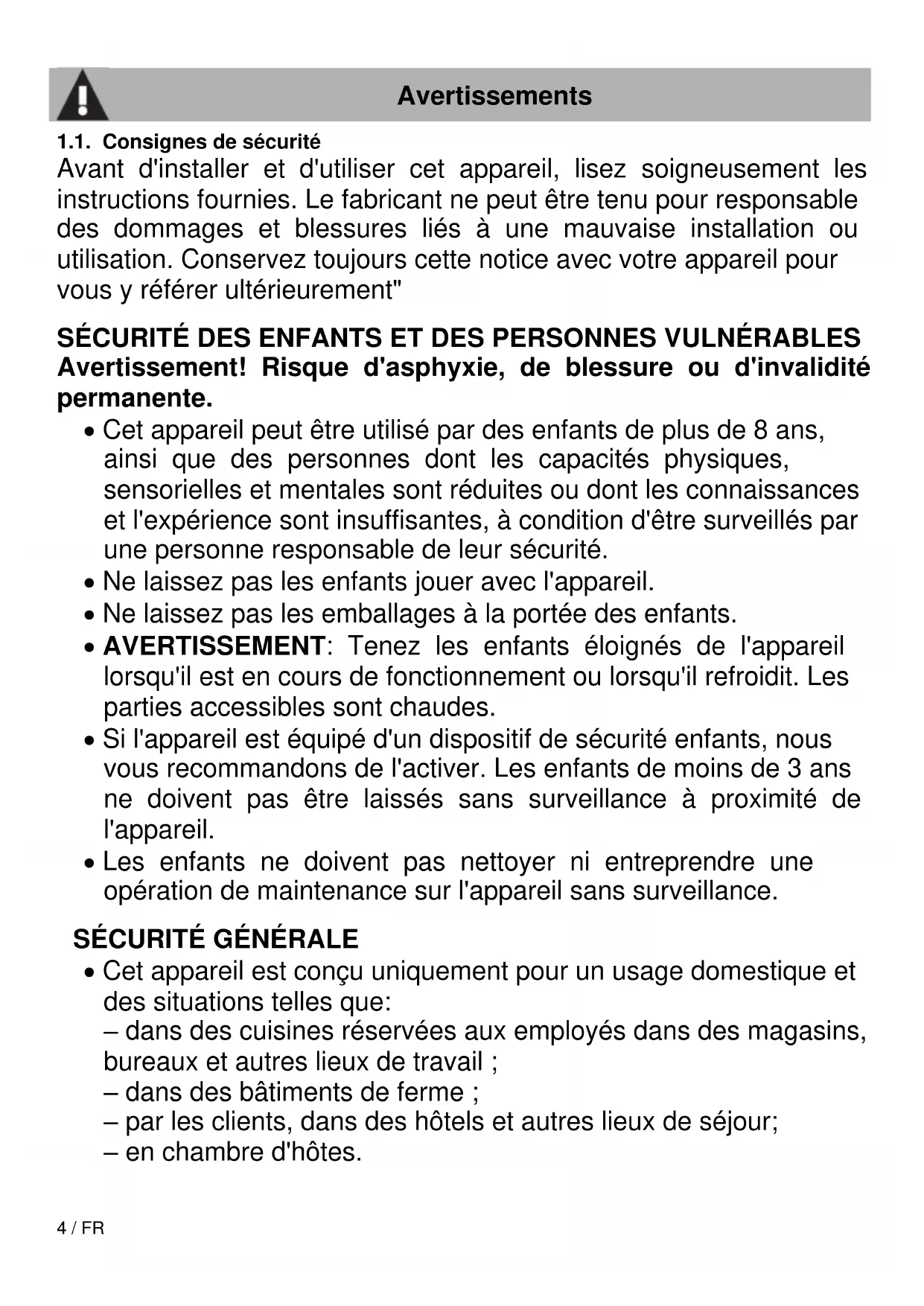 Avertissements 1.1. Consignes de sécurité Avant d'installer et d'utiliser cet appareil, lisez soigneusement les instructions fournies. Le fabricant ne peut être tenu pour responsable des dommages et blessures liés à une mauvaise installation ou utilisation. Conservez toujours cette notice avec votre appareil pour vous y référer ultérieurement" SÉCURITÉ DES ENFANTS ET DES PERSONNES VULNÉRABLES Avertissement! Risque d'asphyxie, de blessure ou d'invalidité permanente.