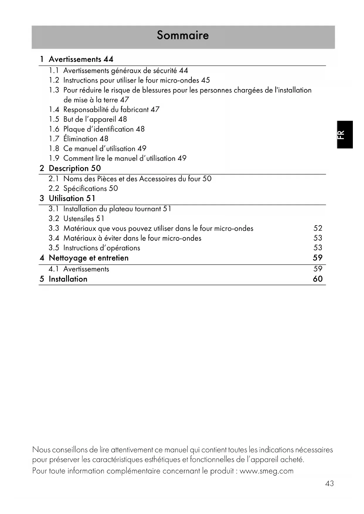5 Installation 60 Nous conseillons de lire attentivement ce manuel qui contient toutes les indications nécessaires pour préserver les caractéristiques esthétiques et fonctionnelles de l’appareil acheté. Pour toute information complémentaire concernant le produit : www.smeg.comAvertissements