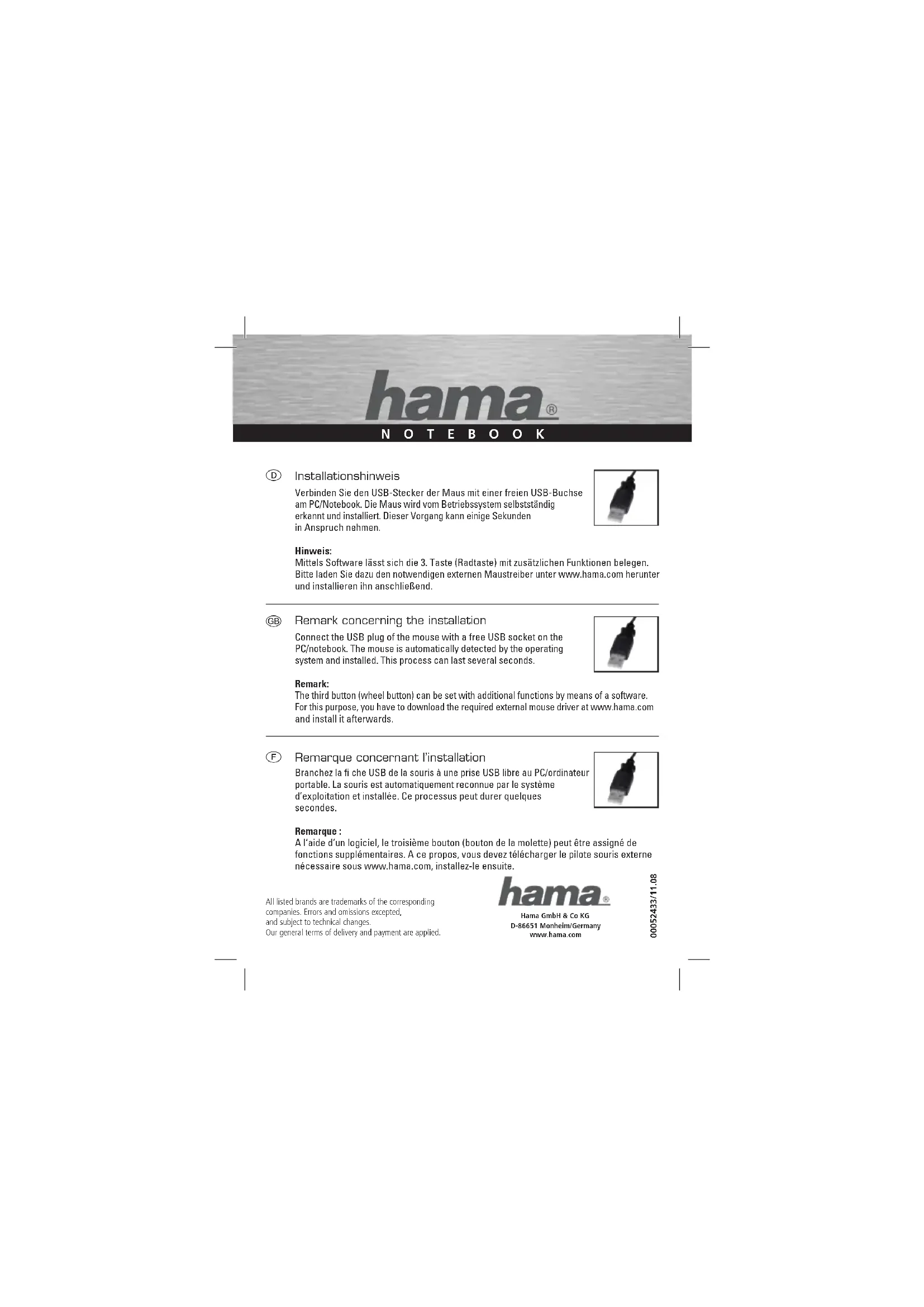 Installationshinweis Branchez la fi che USB de la souris à une prise USB libre au PC/ordinateur portable. La souris est automatiquement reconnue par le système d’exploitation et installée. Ce processus peut durer quelques secondes. Remarque : A l‘aide d‘un logiciel, le troisième bouton (bouton de la molette) peut être assigné de fonctions supplémentaires. A ce propos, vous devez télécharger le pilote souris externe nécessaire sous www.hama.com, installez-le ensuite.