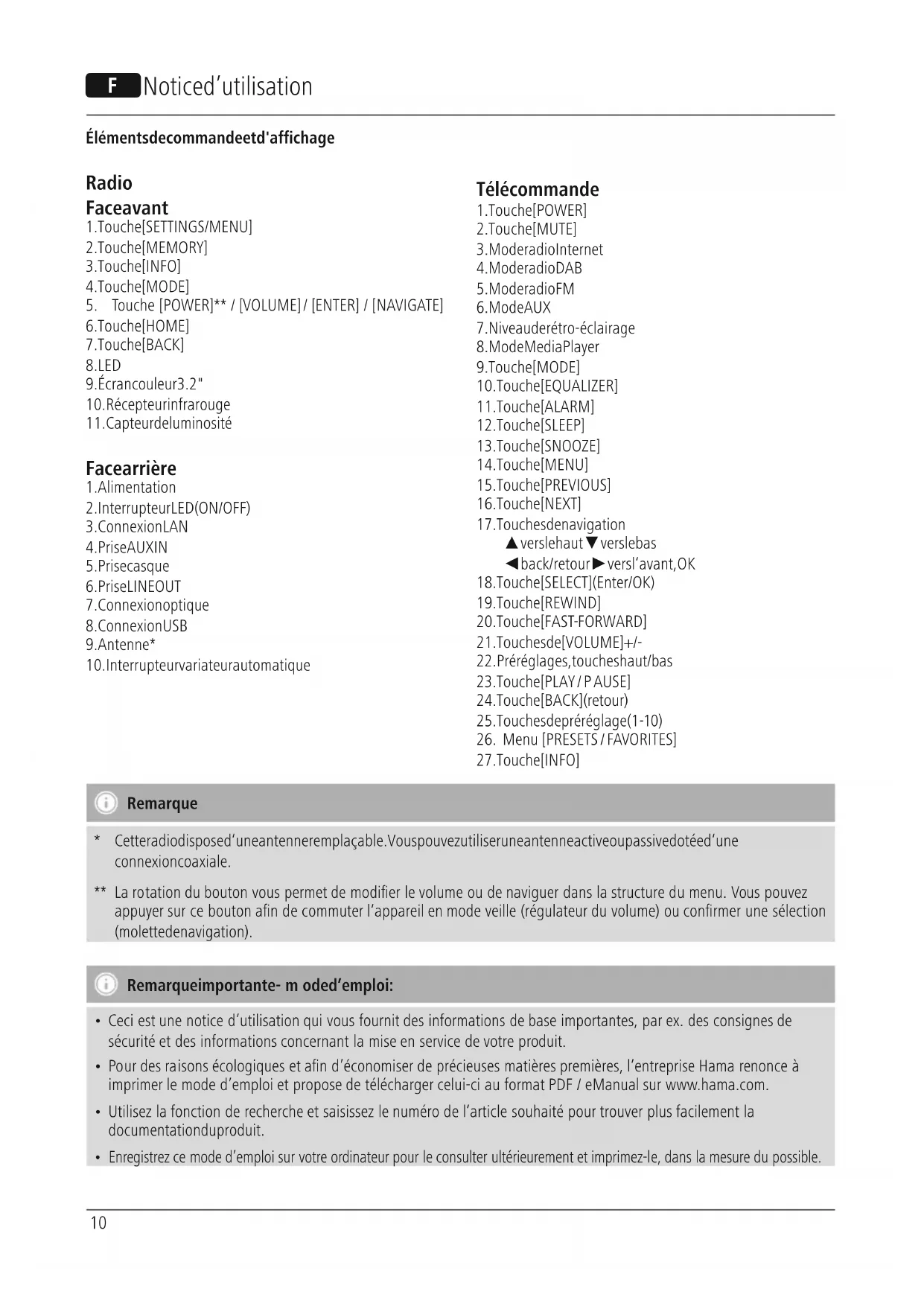 Cette radio dispose d‘une antenne remplaçable. Vous pouvez utiliser une antenne active ou passive dotée d‘une connexion coaxiale. ** La rotation du bouton vous permet de modier le volume ou de naviguer dans la structuredumenu. Vous pouvez appuyer sur ce bouton andecommuter l‘appareil en mode veille (régulateur du volume) ou conrmer une sélection (molette de navigation). Remarque importante -mode d’emploi :