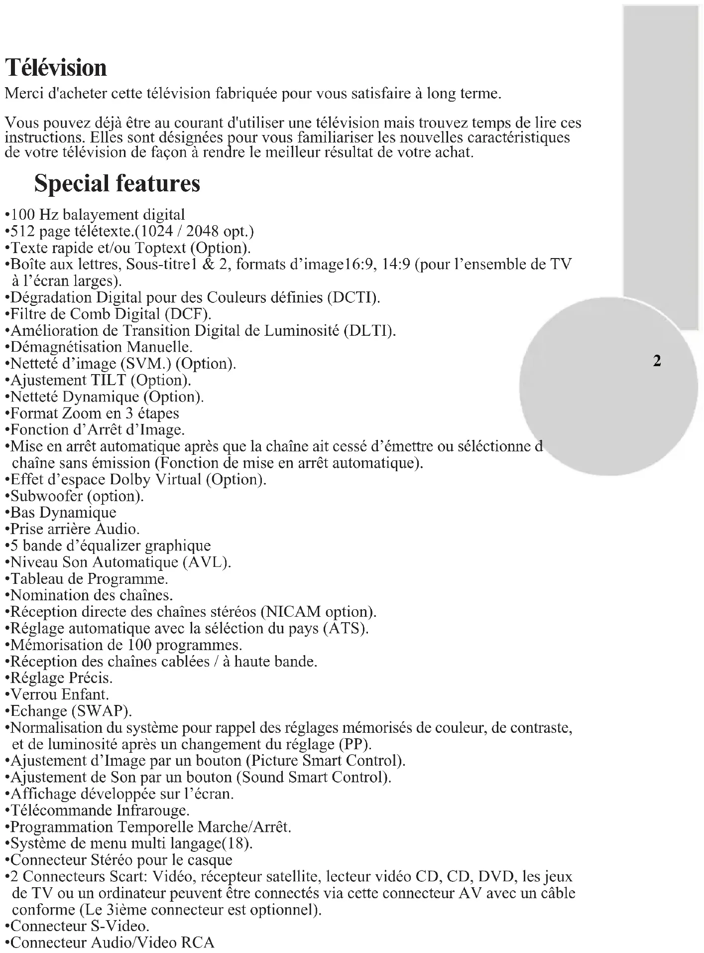 - Tableau de spécifications téchniques Télévision Merci d'acheter cette télévision fabriquée pour vous satisfaire à long terme. Vous pouvez déjà être au courant d'utiliser une télévision mais trouvez temps de lire ces instructions. Elles sont désignées pour vous familiariser les nouvelles caractéristiques de votre télévision de façon à rendre le meilleur résultat de votre achat. Special features p. 27