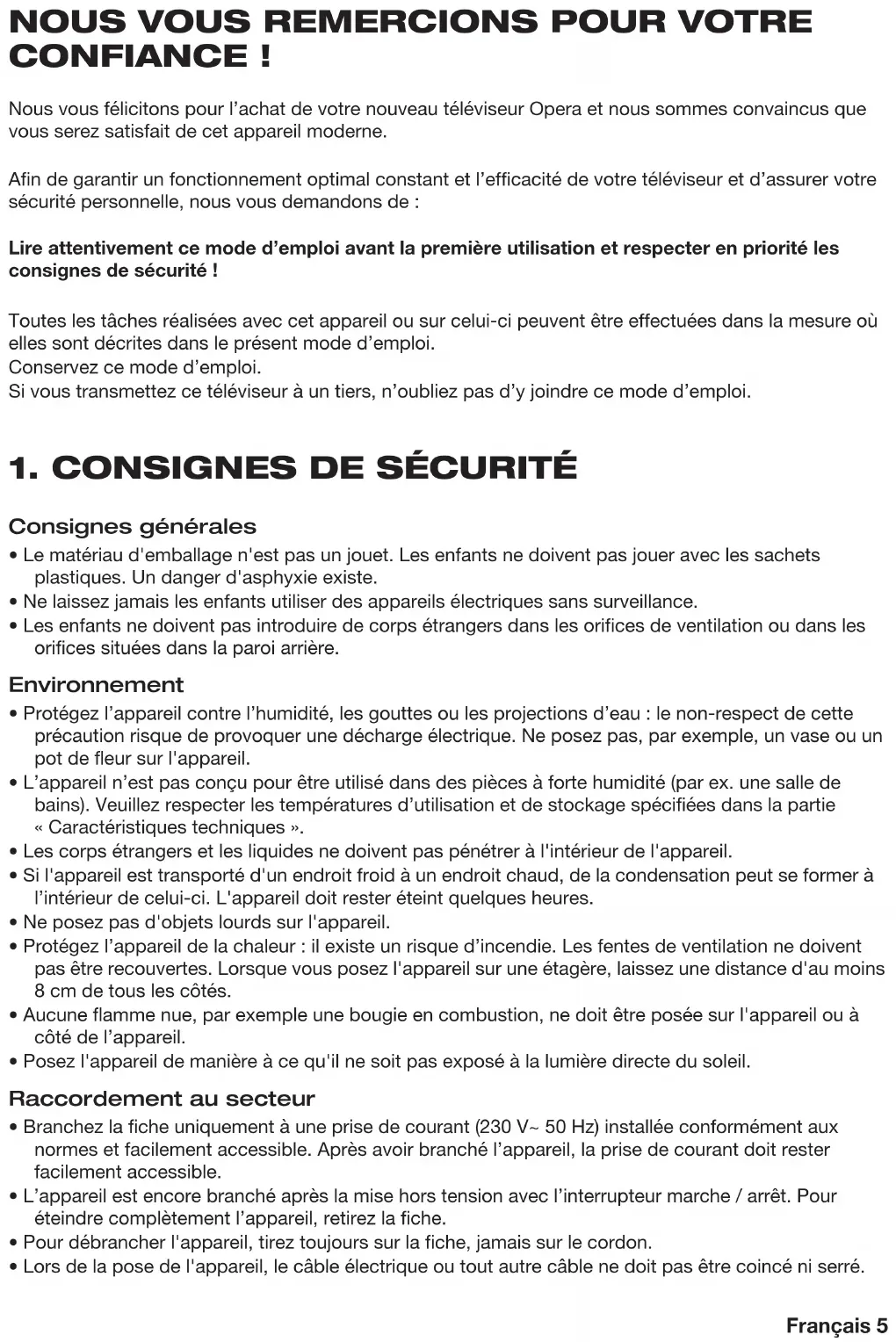 CONFIANCE ! Nous vous félicitons pour l’achat de votre nouveau téléviseur Opera et nous sommes convaincus que vous serez satisfait de cet appareil moderne. Afin de garantir un fonctionnement optimal constant et l’efficacité de votre téléviseur et d’assurer votre sécurité personnelle, nous vous demandons de : Lire attentivement ce mode d’emploi avant la première utilisation et respecter en priorité les consignes de sécurité ! Toutes les tâches réalisées avec cet appareil ou sur celui-ci peuvent être effectuées dans la mesure où elles sont décrites dans le présent mode d’emploi. Conservez ce mode d’emploi. Si vous transmettez ce téléviseur à un tiers, n’oubliez pas d’y joindre ce mode d’emploi.