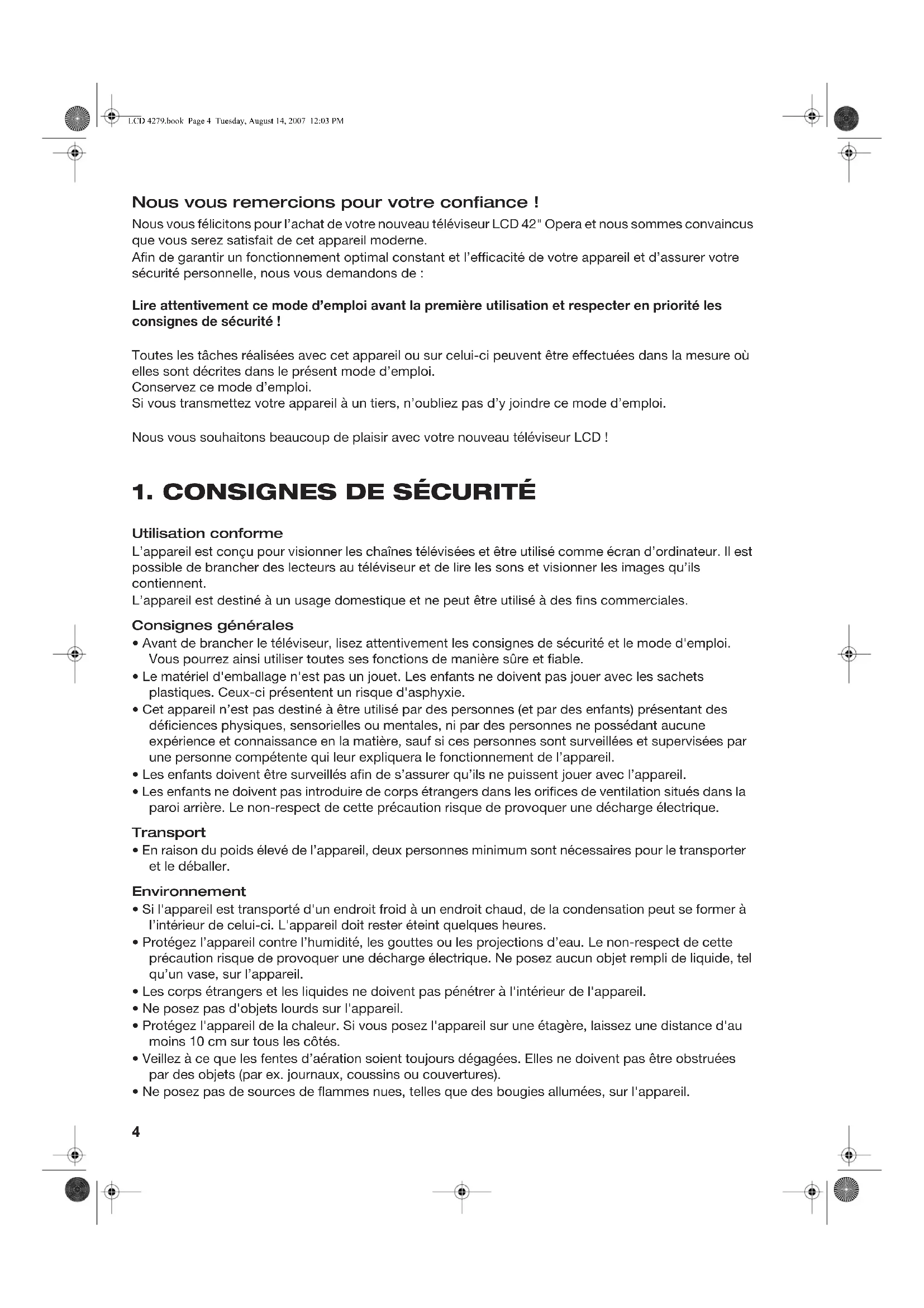 16. Conditions de garantie ............................................................................................... 28 LCD 4279.book Page 3 Tuesday, August 14, 2007 12:03 PM4 Nous vous remercions pour votre confiance ! Nous vous félicitons pour l’achat de votre nouveau téléviseur LCD 42" Opera et nous sommes convaincus que vous serez satisfait de cet appareil moderne. Afin de garantir un fonctionnement optimal constant et l’efficacité de votre appareil et d’assurer votre sécurité personnelle, nous vous demandons de : Lire attentivement ce mode d’emploi avant la première utilisation et respecter en priorité les consignes de sécurité ! Toutes les tâches réalisées avec cet appareil ou sur celui-ci peuvent être effectuées dans la mesure où elles sont décrites dans le présent mode d’emploi. Conservez ce mode d’emploi. Si vous transmettez votre appareil à un tiers, n’oubliez pas d’y joindre ce mode d’emploi. Nous vous souhaitons beaucoup de plaisir avec votre nouveau téléviseur LCD !