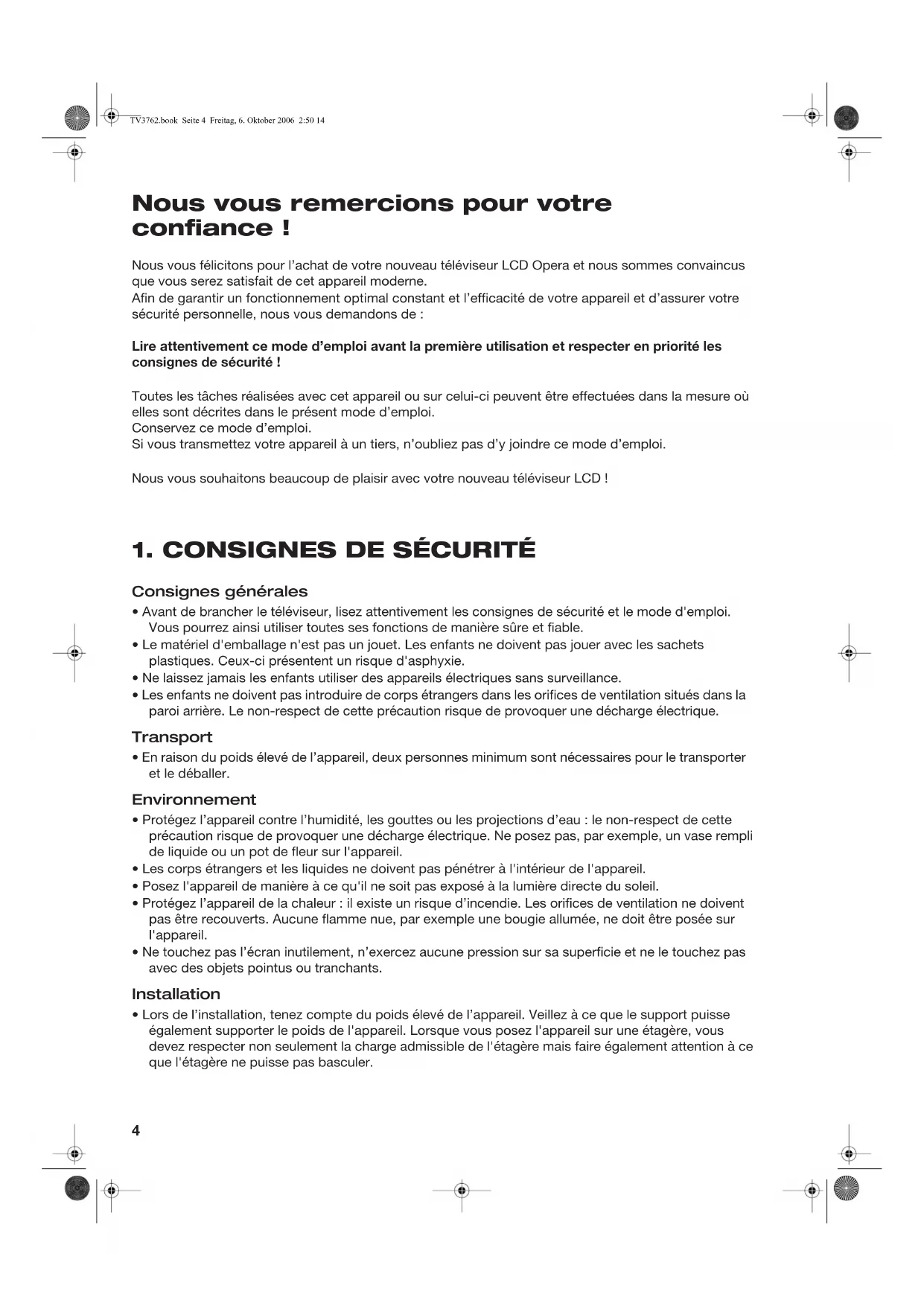 17. Conditions de garantie ............................................................................................... 35 TV3762.book Seite 3 Freitag, 6. Oktober 2006 2:50 144 Nous vous remercions pour votre confiance ! Nous vous félicitons pour l’achat de votre nouveau téléviseur LCD Opera et nous sommes convaincus que vous serez satisfait de cet appareil moderne. Afin de garantir un fonctionnement optimal constant et l’efficacité de votre appareil et d’assurer votre sécurité personnelle, nous vous demandons de :