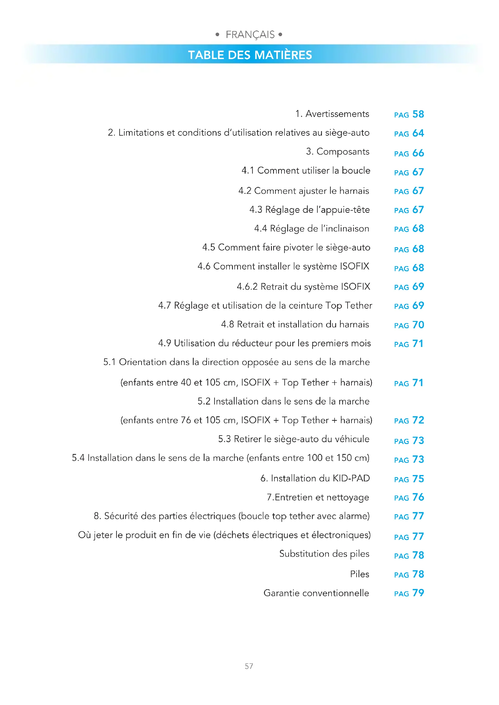 Ceinture de sécurité à 3 points ou ISOFIX + ceinture de sécurité à 3 points) Il est conseillé d’utiliser la ceinture à 5 points aussi longtemps que possible. Lorsque l’enfant grandit et atteint une hauteur de 100 cm, le siège-auto doit être transformé pour l’utilisation avec des enfants d’une hauteur comprise entre 100 et 150 cm. Dans cette configuration, il est impératif de retirer la ceinture à 5 points (harnais) fournie de série avec le siège-auto. Retirer le harnais. Faire pivoter le siège dans le sens de la marche. Positionner le siège de manière à l’orienter dans le sens de la marche (fig. 57 e 58). Veillez à ce qu’il soit correctement bloqué. Fixer les connecteurs ISOFIX. Si le siège du véhicule n’est pas équipé du système d’ancrage ISOFIX, seule la ceinture de sécurité 3 points peut être utilisée pour le montage. INSTALLATION DANS LE VÉHICULE INSTALLATION DANS LE VÉHICULE• FRANÇAIS • • FRANÇAIS •