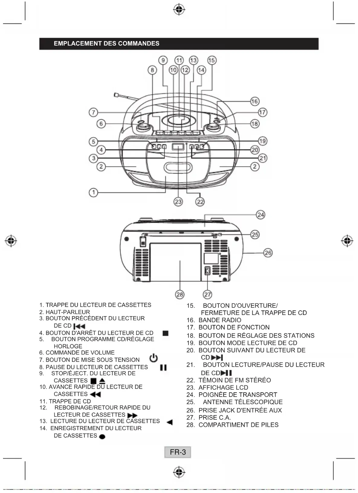 choc électrique, ne pas retirer le couvercle. L'intérieur de l'appareil ne contient aucune pièce réparable par l'utilisateur.Conertoutentretienàdu personnelqualié. Le point d'exclamation dans le tr iangle es t u n signe d'avertissement qui attire l'attention de l'utilisateur sur des instructions importantes qui accompagnent le produit.L'éclair f l é c h é dans le t r i a n g le e s t u n s i g n e d'avertissement qui attire votre attention sur une « ten-sion dangereuse » présente à l' intér ieur du produ it . Mise en garde : Ne pas toucher la lentille. NE PAS JETER LES PILES DANS LE FEU ! Encasdedysfonctionnementdûàunedécharged'électricitéstatique,l'appareildoitêtreréinitialiséenledébranchantde l'alimentation secteur. ATTENTION L'ÉTIQUETTE DE MARQUE ET DE CARACTÉRISTIQUES SE TROUVE À L'ARRIÈRE DE L'APPAREIL. FR-215. BOUTOND'OUVERTURE/