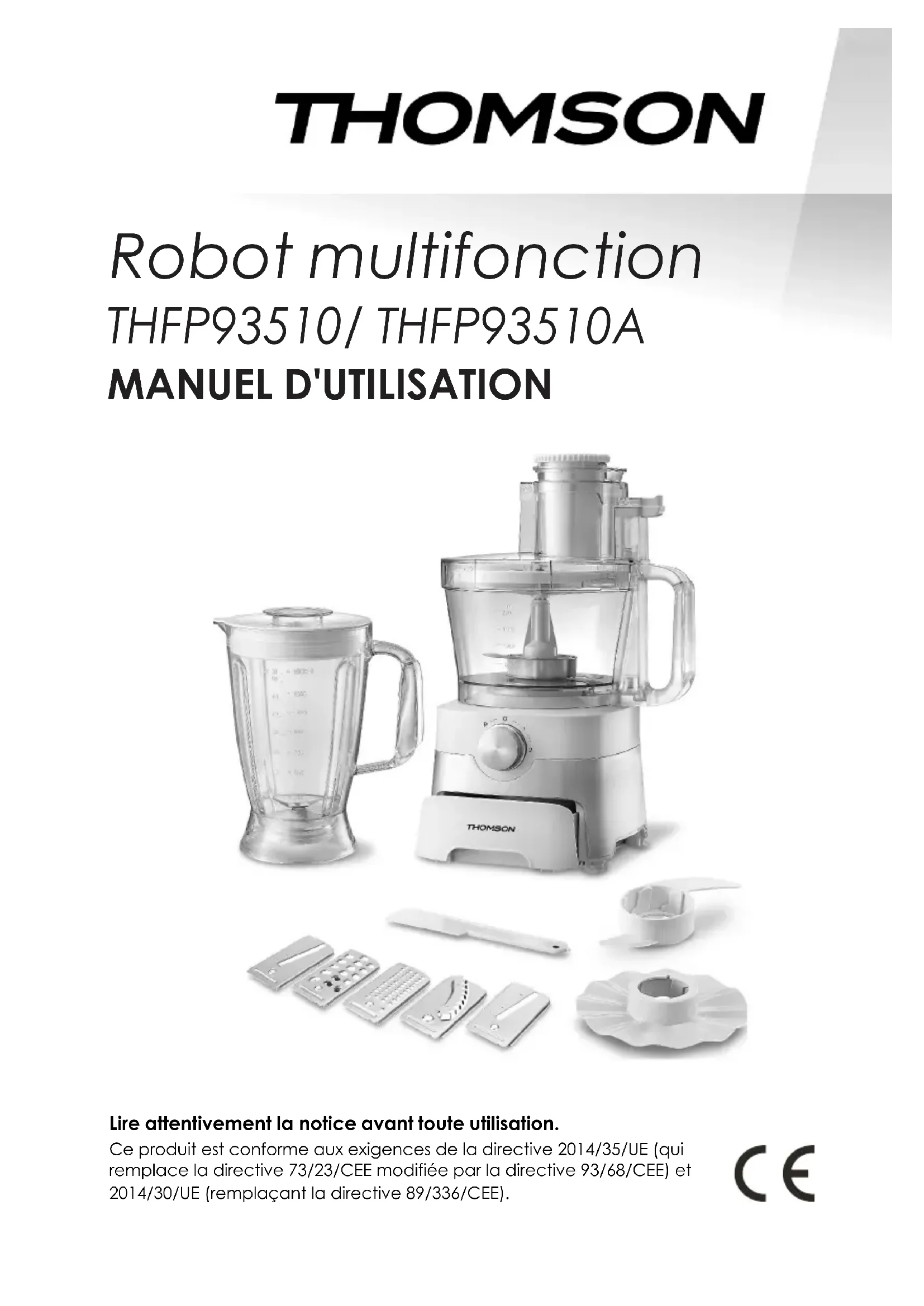 Référence : THFP93510 / THFP93510A Tension : 220-240V~ 50/60Hz Puissance nominale : 1000 W Capacité du bol de mélange : 1,8L Capacité utile de: 2L L'appareil ne fonctionne pas. Assurez-vous que le montage est correct. Assurez-v ous que le câble d'alimentation est correctement branché. Vérifiez si l'alimentation électrique est activée, ou s'il y a une panne de courant. Le robot s'arrête brusquement de fonctionner. Le bol peut se déverrouiller si le robot fonctionne trop vigoureusement. Replacez le couvercle sur le bol. Le moteur fonctionne, mais les pièces de coupe ne tournent pas. Assurez-vous que l'arbre d'entrainement est correctement installé.ATTENTION Ce logo appose sur le produit signifie qu'il s'agit d'un appareil dont le traitement en tant que déchet rentre dans le cadre de la directive 2012/19/EU, relative aux déchets d'équipements électriques et électroniques (DEEE). La présence de substances dangereuses dans les équipements électriques et électroniques peut avoir des effets potentiels sur l'environnement et la santé humaine dans le cycle de retraitement de ce produit. Ainsi, lors de la fin de vie de l’appareil, celui-ci ne doit pas être débarrasse avec les déchets municipaux non tries. En tant que consommateur final, votre rôle est primordial dans le cycle de réutilisation, de recyclage et les autres formes de valorisation de el équipement. Électrique et électronique. Des systèmes de reprise et de collecte sont mis à votre disposition par les collectivités locales (déchetteries) et les distributeurs. Vous avez !'Obligation d'utiliser les systèmes de collecte sélective mise à votre disposition. Elimination et respect de l'environnement Si vous souhaitez vous débarrasser de votre appareil électrique car il a besoin d'être remplace ou n'est plus utilise, pensez à protéger l'environnement. Demandez conseil aux collectivités locales, car il existe de Nombreuses déchetteries respectueuses de l'environnement. GARANTIE La garantie ne couvre pas les pièces d’usure du produit, ni les problèmes ou les dommages résultant de: (1) détériorations superficielles dues à l'usure normale du produit ; (2) défauts ou détériorations dus au contact du produit avec des liquides et dus à la corrosion provoquée par la rouille ou de présence d'insectes; (3) tout incident, abus, utilisation impropre, modification, démontage ou réparation non autorisés; (4) toute opération impropre d'entretien, utilisation non conforme aux instructions concernant le produit ou le branchement à une tension incorrecte ; (5) toute utilisation d'accessoires non fournis ou non approuvés par le fabricant. La garantie sera annulée en cas d'élimination de la plaque signalétique et/ou du numéro de série du produit. THOMSON est une marque de Technicolor SA utilisée sous licence par SCHNEIDER CONSUMER GROUP. Ce produit est importé par SCHNEIDER CONSUMER GROUP 12, rue Jules Ferry, 93110 Rosny-sous-Bois, FRANCEMultifunction food processor