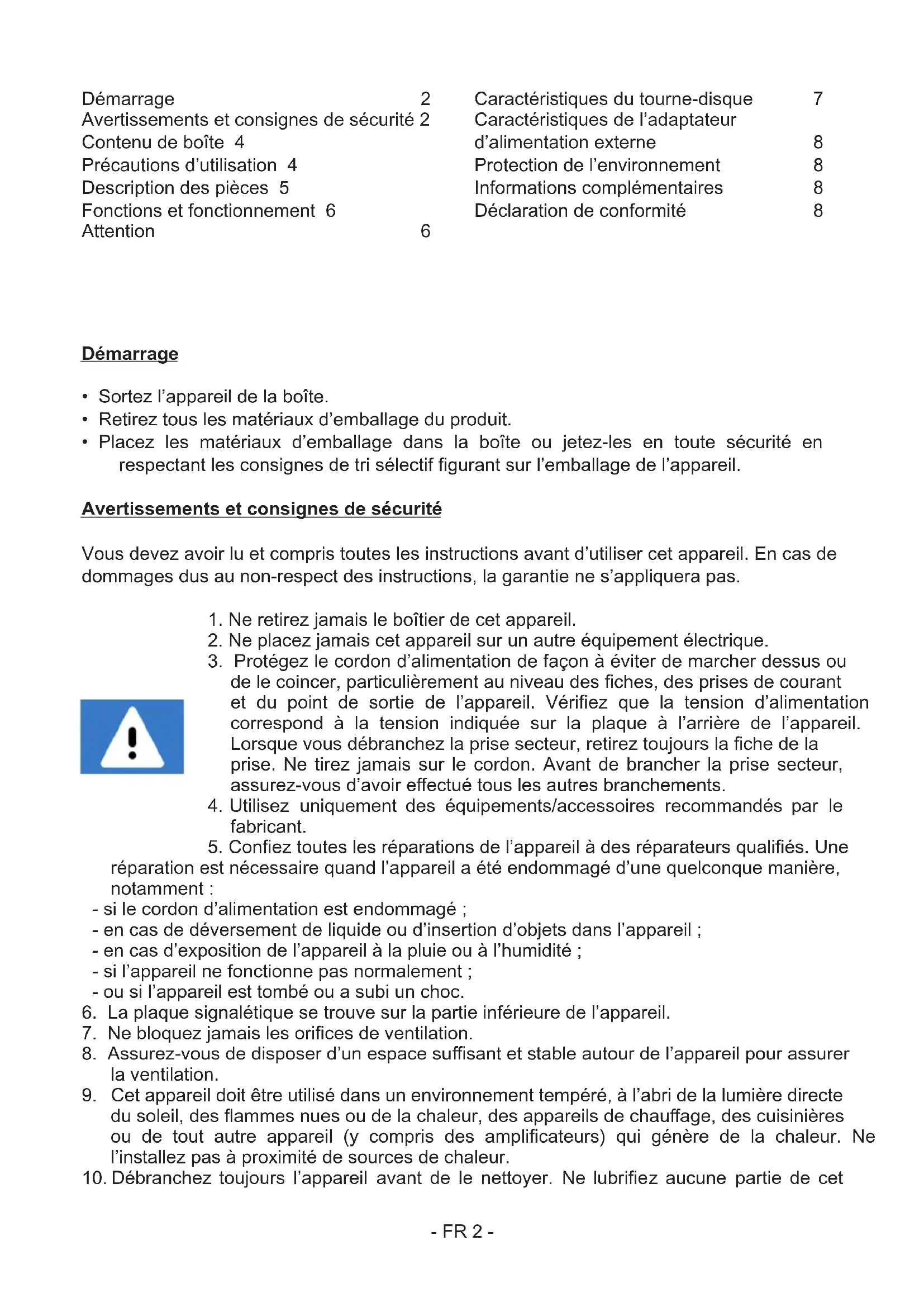 Démarrage 2 Avertissements et consignes de sécurité 2 Contenu de boîte 4 Précautions d’utilisation 4 Description des pièces 5 Fonctions et fonctionnement 6 Attention 6 Caractériiques du tourne-disque 7 Caractériiques de l’adaptateur d’alimentation externe 8 Protection de l’environnement 8 Informations complémentaires 8 Déclaration de conformité 8- FR 3 - appareil. Nettoyez-le avec un chion doux. N’utilisez pas de produits abrasifs ni de nettoyants agressifs. Le nettoyage et l’entretien ne doivent pas être eectués par des enfants sans surveillance.
