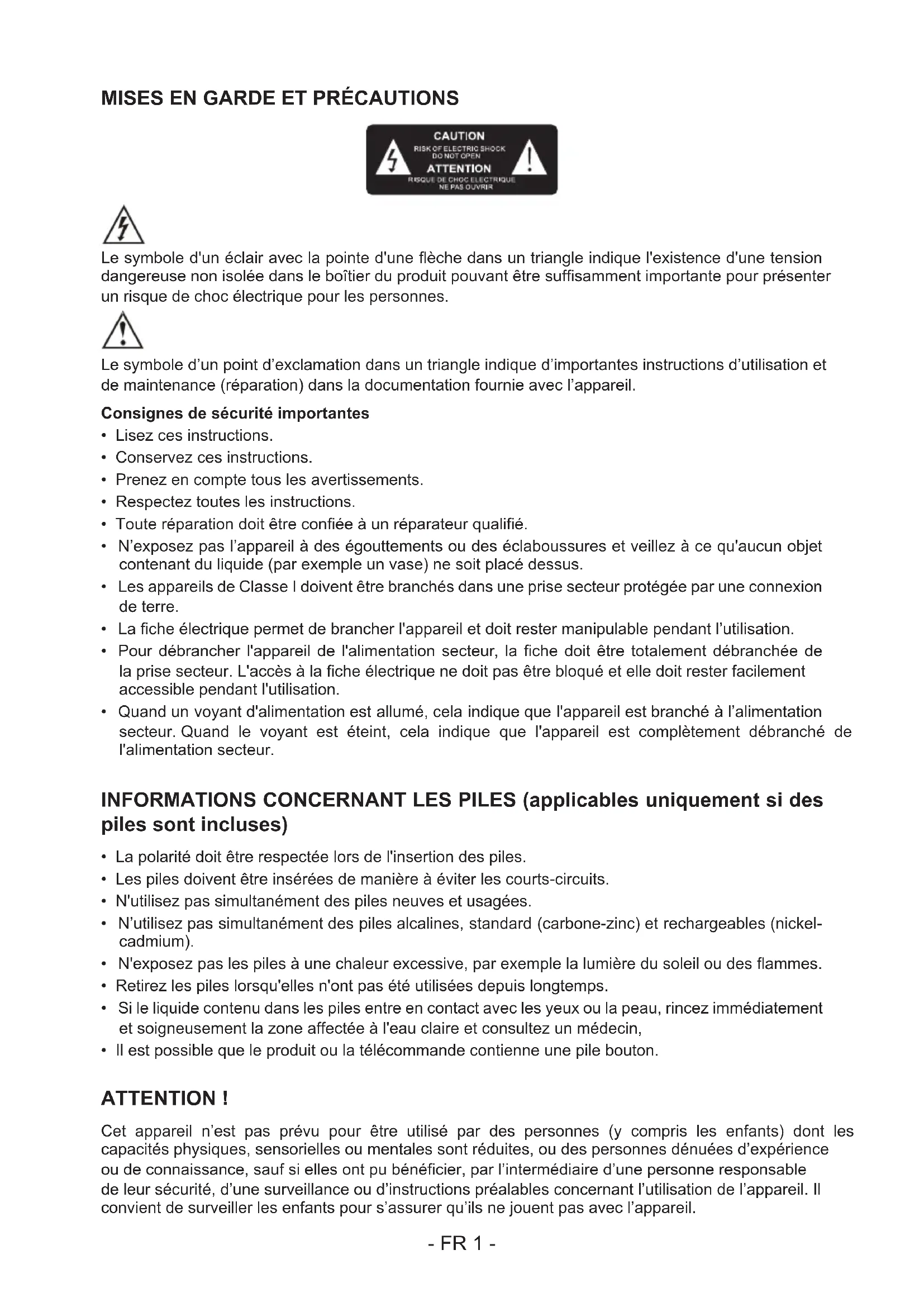 - Il est possible que le produit ou la télécommande contienne une pile bouton. ATTENTION ! Cet appareil n’est pas prévu pour être utilisé par des personnes (y compris les enfants) dont les capacités physiques, sensorielles ou mentales sont réduites, ou des personnes dénuées d’expérience ou de connaissance, sauf si elles ont pu bénécier, par l’intermédiaire d’une personne responsable de leur sécurité, d’une surveillance ou d’instructions préalables concernant l’utilisation de l’appareil. Il convient de surveiller les enfants pour s’assurer qu’ils ne jouent pas avec l’appareil.- FR 2 - AVERTISSEMENT CONCERNANT LES PILES : N’avalez pas la/les piles. Risque de brûlure chimique. Ce produit contient une pile ou des piles. Si une pile est avalée, elle peut provoquer de graves brûlures internes en 2 heures à peine et causer la mort. Conservez les piles neuves et usagées hors de portée des enfants ou de toute personne vulnérable. Si le compartiment à pile(s) ne se fermait plus correctement, arrêtez d’utiliser le produit. Si jamais une pile était ingérée, consultez immédiatement un médecin. REMARQUES IMPORTANTES : Risque d’explosion de la pile si celle-ci n’est pas correctement remplacée ou si l’appareil n’est pas utilisé durant un certain temps. Remplacez la pile avec un modèle identique ou équivalent. Double isolation Courant continu Courant alternatif Symbole d’usage en intérieur Respect de l’environnement Votre produit est conçu et fabriqué avec des matériaux et composants de haute qualité qui peuvent être recyclés et réutilisés. Votre produit contient des piles couvertes par la Directive Européenne 2006/66/CE, selon laquelle elles ne peuvent pas être jetées avec les déchets ménagers normaux. Veuillez vous informer sur les réglementations locales concernant la collecte séparée des piles car une mise au rebut correcte permet d’empêcher les conséquences négatives sur l’environnement et sur la santé humaine. Lorsque le symbole d’une poubelle barrée sur roues se trouve sur un produit, cela signie que le produit est couvert par la Directive Européenne 2002/96/CE. Veuillez vous informer du système local de collecte séparée pour les produits électriques et électroniques. Veuillez agir selon les règles locales et ne jetez pas vos anciens produits avec les ordures ménagères. En assurant l’élimination de ce produit, vous aidez également à prévenir les conséquences potentiellement négatives pour l’environnement et la santé humaine. Conformité Ce produit est conforme aux exigences des directives de l’Union Européenne relatives aux interférences radio. Cet appareil comporte ce marquage.- FR 3 - Alimentation par piles : Assurez-vous que les piles sont correctement insérées pour éviter tout dommage sur l'appareil. Enlevez toujours les piles de l'appareil si celui-ci ne sera pas utilisé durant une longue période, car cela pourrait causer une fuite des piles et par conséquent, des dommages sur l'appareil. Les piles utilisées doivent impérativement être de même type. N'utilisez jamais différents types de piles ensemble. Ne jetez pas les piles dans un feu, et ne les exposez pas au soleil ou à une source de chaleur. Si le liquide contenu dans les piles entre en contact avec les yeux ou la peau, lavez la zone immédiatement et soigneusement à l'eau fraîche et consultez un médecin. ATTENTION