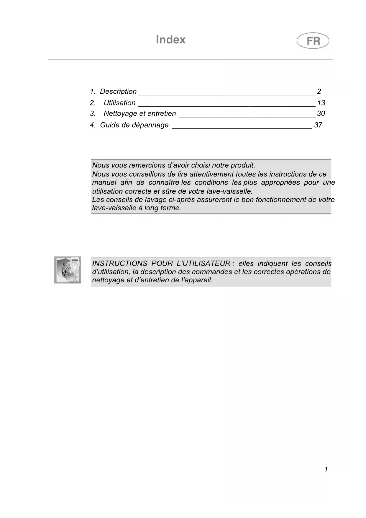 Nous vous remercions d’avoir choisi notre produit. Nous vous conseillons de lire attentivement toutes les instructions de ce manuel afin de connaître les conditions les plus appropriées pour une utilisation correcte et sûre de votre lave-vaisselle. Les conseils de lavage ci-après assureront le bon fonctionnement de votre lave-vaisselle à long terme.