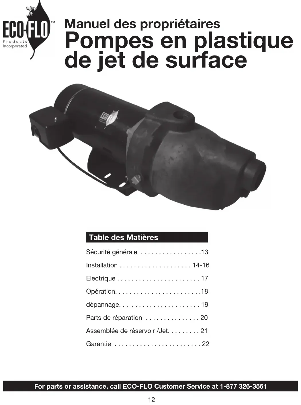 - scellées.Conservez la facture d’achat d’origine pour la garantie d’admissibilité La Garantie Limitée Le fabricant garantit à l’acheteur original ( «Acheteur» ou «Vous» ) que ses produits sont exempts de défauts de matéri- aux et de fabrication pour une période de douze (12) mois à compter de la date de l’achat par le consommateur. Si, dans les douze (12) mois à compter de l’achat au détail original, tout produit s’avère défectueux, il doit être réparé ou remplacé, au choix du fabricant, dépend des modalités et conditions énoncées dans les présentes. Notez que cette garantie limitée s’applique aux défauts de fabrication seulement et non à l’usure normale. Tous les appareils mécaniques ont besoin de pièces et de service périodiques pour marcher le puit. Cette garantie limitée ne couvre pas les réparations quand l’usure normale a épuisé la durée d’une partie ou de l’équipement. L’étiquette facture d’achat et la garantie du produit d’origine des informations sont nécessaires pour déterminer l’admissibilité garantie. L’admissibilité est basée sur la date d’achat ou d’un produit d’origine - pas la date de remplace- ment sous la garantie. La garantie est limitée à la réparation ou le remplacement du produit acheté d’origine seulement, pas le produit de remplacement (c’est à dire le remplacement d’une garantie autorisé par achat). L’ acheteur paie tout retrait, l’installation, la main-d’œuvre, le transport et les frais accessoires. Les réclamations faites en vertu de cette garantie doit être faite en contactant et retourner le produit à l’usine immédiate- ment après la découverte ou toute irrégularité alléguée. Aucune demande de service ne sera acceptée si elle est reçue plus de 30 jours après l’expiration de la garantie. La garantie n’est pas transférable et ne s’applique pas aux produits utilisés dans des applications commerciales / de location. Les termes et les conditions généraux; Les limitations de recours Vous devez payer tous les travaux et les charges nécessaires au remplacement du produit couvert par cette garantie. Cette garantie ne s’applique pas à ce qui suit: (1) les actes de Dieu; (2) les produits qui, dans le seul jugement de fabri- cant, ont fait l’objet de négligence, d’abus, d’un accident, une mauvaise utilisation, l’altération ou la modication; (3) les défaillances dues à une mauvaise installation, l’exploitation, l’entretien ou le stockage; (4) l’application, l’utilisation, ou le service atypique ou non approuvé; (5) les défaillances causées par la corrosion, la rouille ou d’autres matières étrangères dans le système, ou le fonctionnement à des pressions supérieures à la limite maximale recommandée. Cette garantie dénit la seule obligation du fabricant et le recours exclusif de l’acheteur des produits défectueux. Le fabricant ne peut être tenu responsable des dommages indirects, accessoires, ou continent que ce soit. Les précéden- tes garanties limitée sont exclusives et au lieu de toutes les autres garanties expresses et implicites, y compris mais non limité aux garanties implicites de qualité marchande et d’adéquation à un usage particulier. Les précédentes garanties limitée ne doivent pas s’étendre au-delà de la durée prévue aux présentes. Certains états ne permettent pas l’exclusion ou la limitation des dommages accessoires ou consécutifs ou les limitations limitations sur la durée d’une garantie implicite, de sorte que les limitations ou les exclusions ci-dessus peuvent ne pas vous concerner. Cette garantie vous donne des droits légaux spéciques et vous pouvez également avoir d’autres droits qui varient d’un État à l’autre. GARANTIE 1899 Cottage Street, Ashland, Ohio 44805 Téléphonez: 1-877-326-3561 Fax: 1-877-326-1994 www.ecooproducts.com 22Manual del usuario Bombas Jet poco profundos de plástico Seguridad General p. 24