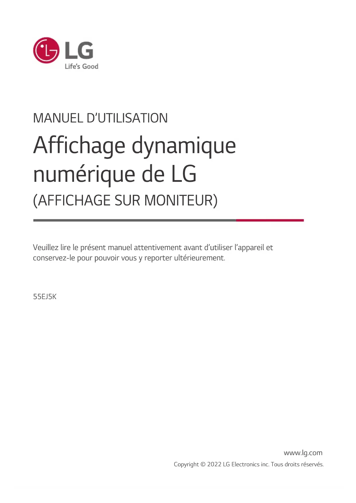 Affichage dynamique numérique de LG (AFFICHAGE SUR MONITEUR) 55EJ5K Veuillez lire le présent manuel attentivement avant d’utiliser l’appareil et conservez-le pour pouvoir vous y reporter ultérieurement. www.lg.com Copyright © 2022 LG Electronics inc. Tous droits réservés.2 FRANÇAIS