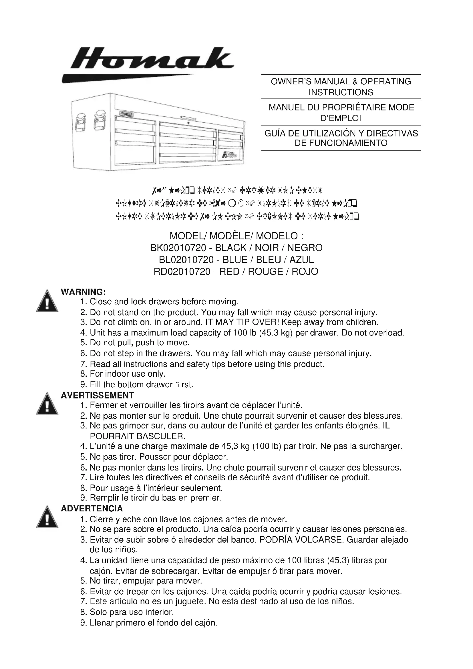 B) Clés A) Doublures En Mousse Pour Chaque Tiroir Et Caisson Supérieur C) 2 attaches D) 4 boulons E) Poignée de core supérieur F) 2 tornillos para tirador de cofre superior AttachesBoulonsCOFFRE À ROULETTES COFFRE SUPÉRIEUR Une fois le core supérieur placé sur le core à roulettes, utiliser les attaches (E) et la quincaillerie (F) fournies pour les xer solidement ensemble.* Homak recommande de boulonner le core supérieur au core à roulettes avec les attaches fournies.- 5 - ENTRETIEN Glissières à roulement à billes Note : vider le tiroir avant de le retirer. Ne jamais surcharger les tiroirs. Pour retirer les tiroirs et les glissières, ouvrir complètement le tiroir. Dé- gager les leviers noirs sur chaque côté. Sur les glissières à roulement à billes, il y a un levier noir de chaque côté. Un levier sera poussé vers le bas d’un côté et vers le haut de l’autre côté pour permettre de retirer le tiroir. Après avoir poussé les leviers, le tiroir est dégagé. Tirer complète- ment le tiroir pour le retirer. Pour installer le tiroir de nouveau, insérer les glissières des côtés du tiroir dans les glissières de l’unité et fermer complètement le tiroir. Pour assurer un mouvement uniforme des glissières à roulement à billes, lubrifi er les rallonges qui logent les roulements à billes à tous les 3 à 6 mois avec un lubrifi ant à base de gelée de pétrole de grande qualité. Fini pulvérisé poudre En cas d’accumulation importante de saleté et de poussière, le fi ni pul- vérisé peut être nettoyé avec du WD-40 ou un savon à l’huile Murphy en utilisant un linge doux, au besoin. Du nettoyant à vitre et un linge doux et humide peut être utilisé pour net- toyer le fi ni sur une base régulière. Satisfaction du client Toutes les pièces mécaniques sont inspectées et réglées pour un fonc- tionnement adéquat avant l’expédition; toutefois, les mécanismes tels les glissières de tiroir et les verrous peuvent bouger durant le transport. En cas de mauvais fonctionnement de ces composants, appeler le service à la clientèle au 1-800-674-6625.