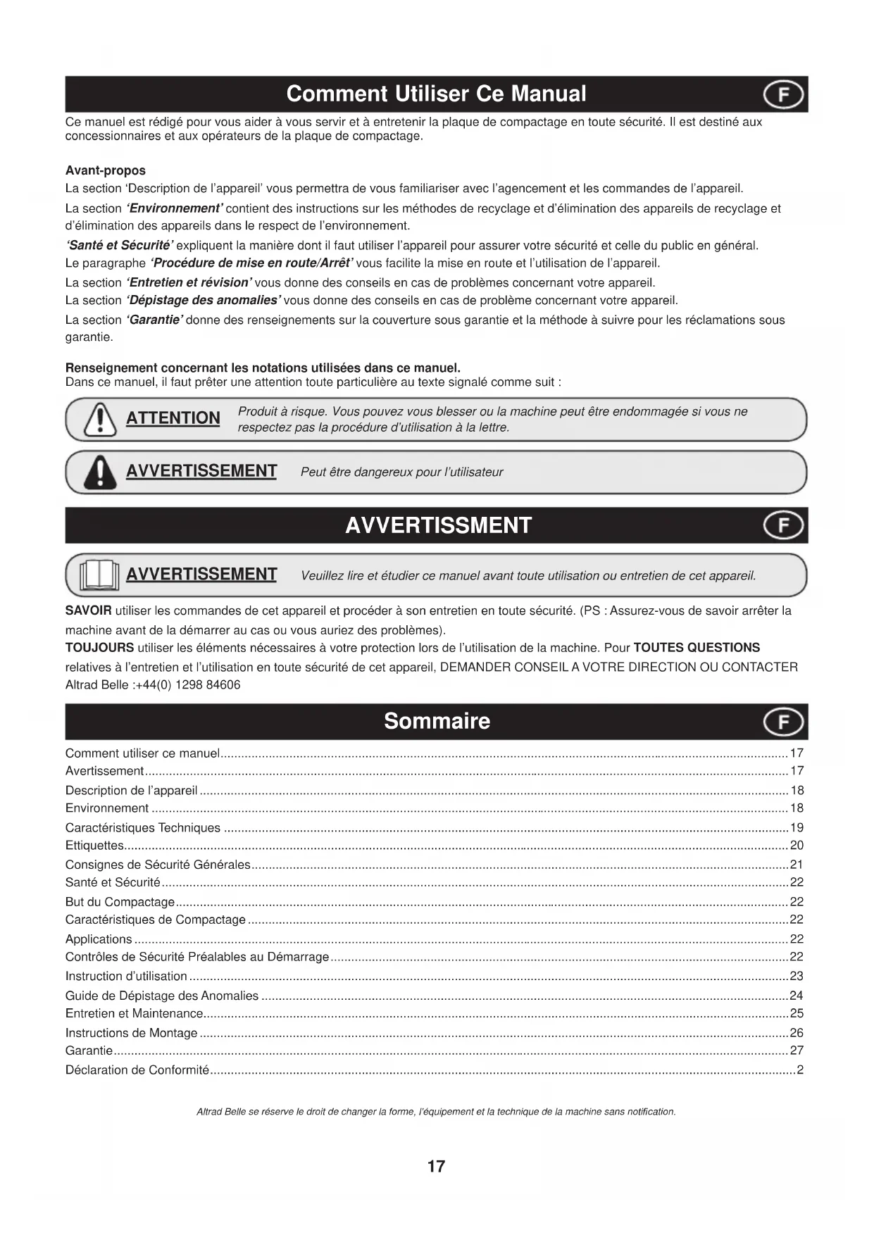 - Drivebelt/s Altrad Belle and/or their recognised agents, directors, employees or insurers will not be held liable for consequential or other damages, losses or expenses in connection with or by reason of or the inability to use the machine for any purpose. Warranty Claims All warranty claims should ¿ rstly be directed to Altrad Belle, either by telephone, by Fax, by Email, or in writing. For warranty claims: Tel: +44 (0)1298 84606 Fax: +44 (0)1298 84073 Email : Warranty@belle-group.co.uk Write to: Altrad Belle Warranty Department, Sheen, Nr. Buxton, Derbyshire, SK17 0EU England. Warranty Registration: In the bid for ALTRAD Belle to become greener and more eco friendly, we have now introduced online Warranty registration. To access the registration page of our website, please use the following address:- http://www.bellegroup.com/index.php?p=warranty_registration Alternatively, please scan the adjacent QR Code (Quick Response Code) using your smartphone to access the registration page. Warranty GB17 Comment Utiliser Ce Manual AVVERTISSMENT Sommaire Peut être dangereux pour l’utilisateur AVVERTISSEMENT Produit à risque. Vous pouvez vous blesser ou la machine peut être endommagée si vous ne respectez pas la procédure d’utilisation à la lettre. ATTENTION SAVOIR utiliser les commandes de cet appareil et procéder à son entretien en toute sécurité. (PS : Assurez-vous de savoir arrêter la machine avant de la démarrer au cas ou vous auriez des problèmes). TOUJOURS utiliser les éléments nécessaires à votre protection lors de l’utilisation de la machine. Pour TOUTES QUESTIONS relatives à l’entretien et l’utilisation en toute sécurité de cet appareil, DEMANDER CONSEIL A VOTRE DIRECTION OU CONTACTER Altrad Belle :+44(0) 1298 84606 Altrad Belle se réserve le droit de changer la forme, l’équipement et la technique de la machine sans noti¿ cation. Veuillez lire et étudier ce manuel avant toute utilisation ou entretien de cet appareil. AVVERTISSEMENT Ce manuel est rédigé pour vous aider à vous servir et à entretenir la plaque de compactage en toute sécurité. Il est destiné aux concessionnaires et aux opérateurs de la plaque de compactage. Avant-propos La section ‘Description de l’appareil’ vous permettra de vous familiariser avec l’agencement et les commandes de l’appareil. La section ‘Environnement’ contient des instructions sur les méthodes de recyclage et d’élimination des appareils de recyclage et d’élimination des appareils dans le respect de l’environnement. ‘Santé et Sécurité’ expliquent la manière dont il faut utiliser l’appareil pour assurer votre sécurité et celle du public en général. Le paragraphe ‘Procédure de mise en route/Arrêt’ vous facilite la mise en route et l’utilisation de l’appareil. La section ‘Entretien et révision’ vous donne des conseils en cas de problèmes concernant votre appareil. La section ‘Dépistage des anomalies’ vous donne des conseils en cas de problème concernant votre appareil. La section ‘Garantie’ donne des renseignements sur la couverture sous garantie et la méthode à suivre pour les réclamations sous garantie. Renseignement concernant les notations utilisées dans ce manuel. Dans ce manuel, il faut prêter une attention toute particulière au texte signalé comme suit : Comment utiliser ce manuel .....................................................................................................................................................................17 Avertissement ...........................................................................................................................................................................................17 Description de l’appareil ...........................................................................................................................................................................18 Environnement .........................................................................................................................................................................................18 Caractéristiques Techniques ....................................................................................................................................................................19 Ettiquettes.................................................................................................................................................................................................20 Consignes de Sécurité Générales ............................................................................................................................................................21 Santé et Sécurité ......................................................................................................................................................................................22 But du Compactage ..................................................................................................................................................................................22 Caractéristiques de Compactage .............................................................................................................................................................22 Applications ..............................................................................................................................................................................................22 Contrôles de Sécurité Préalables au Démarrage .....................................................................................................................................22 Instruction d’utilisation ..............................................................................................................................................................................23 Guide de Dépistage des Anomalies .....