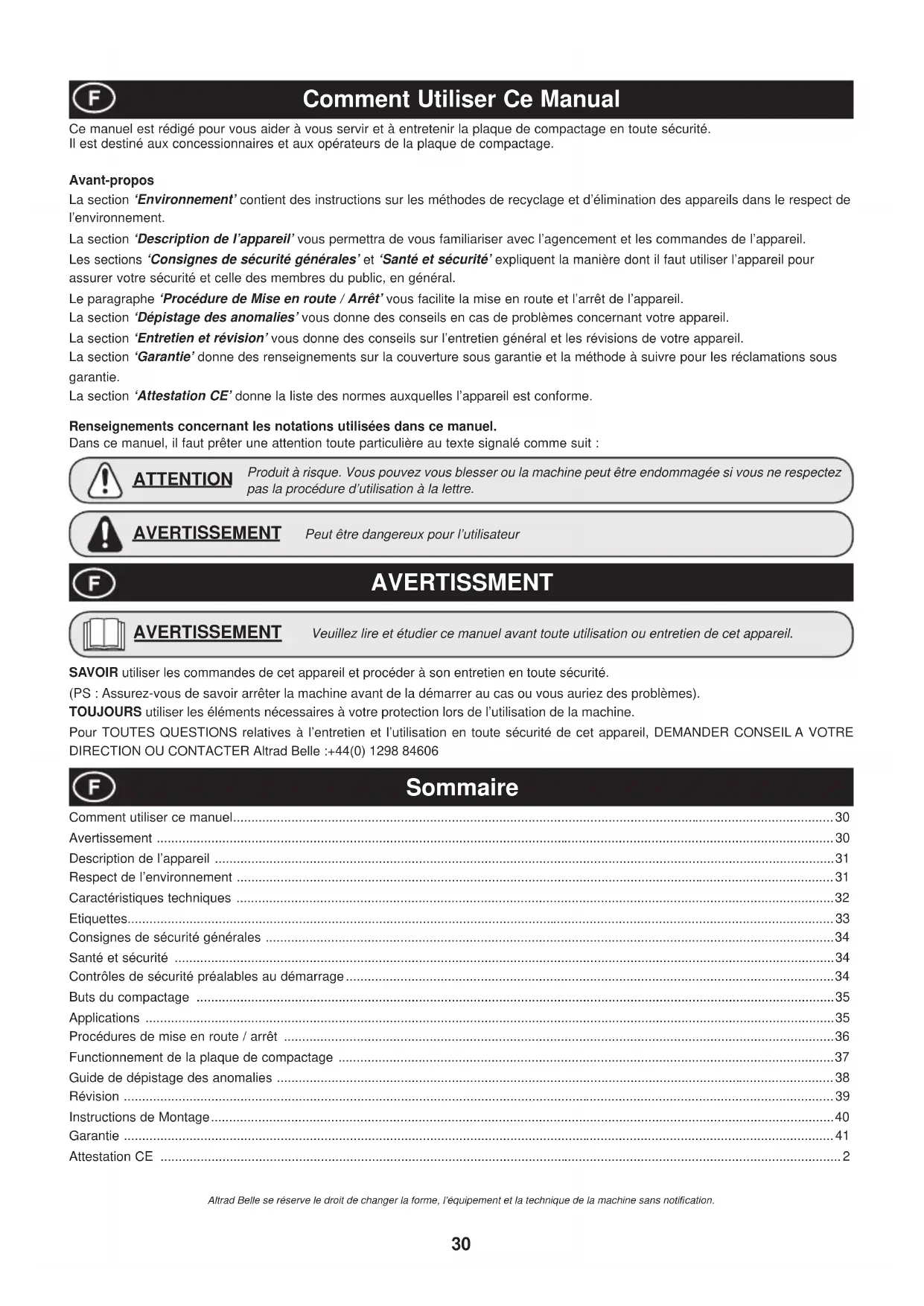 - Engine spark plug Altrad Belle and/or their recognised agents, directors, employees or insurers will not be held liable for consequential or other damages, losses or expenses in connection with or by reason of or the inability to use the machine for any purpose. Warranty Claims All warranty claims should ¿ rstly be directed to Altrad Belle, either by telephone, by Fax, by Email, or in writing. For warranty claims: Tel: +1 540.345.5090 Fax: +1 540.345.5090 Email : BelleGroupInc@aol.com Write to: Altrad Belle Inc, 3959 Electric Road, Roanoke, Suite 360, VA, 24018, USA Warranty Registration: In the bid for ALTRAD Belle to become greener and more eco friendly, we have now introduced online Warranty registration. To access the registration page of our website, please use the following address:- http://www.bellegroup.com/index.php?p=warranty_registration Alternatively, please scan the adjacent QR Code (Quick Response Code) using your smartphone to access the registration page. Warranty30 Comment Utiliser Ce Manual AVERTISSMENT Sommaire Peut être dangereux pour l’utilisateur AVERTISSEMENT Produit à risque. Vous pouvez vous blesser ou la machine peut être endommagée si vous ne respectez pas la procédure d’utilisation à la lettre. ATTENTION SAVOIR utiliser les commandes de cet appareil et procéder à son entretien en toute sécurité. (PS : Assurez-vous de savoir arrêter la machine avant de la démarrer au cas ou vous auriez des problèmes). TOUJOURS utiliser les éléments nécessaires à votre protection lors de l’utilisation de la machine. Pour TOUTES QUESTIONS relatives à l’entretien et l’utilisation en toute sécurité de cet appareil, DEMANDER CONSEIL A VOTRE DIRECTION OU CONTACTER Altrad Belle :+44(0) 1298 84606 Altrad Belle se réserve le droit de changer la forme, l’équipement et la technique de la machine sans noti¿ cation. Veuillez lire et étudier ce manuel avant toute utilisation ou entretien de cet appareil. AVERTISSEMENT Ce manuel est rédigé pour vous aider à vous servir et à entretenir la plaque de compactage en toute sécurité. Il est destiné aux concessionnaires et aux opérateurs de la plaque de compactage. Avant-propos La section ‘Environnement’ contient des instructions sur les méthodes de recyclage et d’élimination des appareils dans le respect de l’environnement. La section ‘Description de l’appareil’ vous permettra de vous familiariser avec l’agencement et les commandes de l’appareil. Les sections ‘Consignes de sécurité générales’ et ‘Santé et sécurité’ expliquent la manière dont il faut utiliser l’appareil pour assurer votre sécurité et celle des membres du public, en général. Le paragraphe ‘Procédure de Mise en route / Arrêt’ vous facilite la mise en route et l’arrêt de l’appareil. La section ‘Dépistage des anomalies’ vous donne des conseils en cas de problèmes concernant votre appareil. La section ‘Entretien et révision’ vous donne des conseils sur l’entretien général et les révisions de votre appareil. La section ‘Garantie’ donne des renseignements sur la couverture sous garantie et la méthode à suivre pour les réclamations sous garantie. La section ‘Attestation CE’ donne la liste des normes auxquelles l’appareil est conforme. Renseignements concernant les notations utilisées dans ce manuel. Dans ce manuel, il faut prêter une attention toute particulière au texte signalé comme suit : Comment utiliser ce manuel .....................................................................................................................................................................30 Avertissement ..........................................................................................................................................................................................30 Description de l’appareil ..........................................................................................................................................................................31 Respect de l’environnement ....................................................................................................................................................................31 Caractéristiques techniques ....................................................................................................................................................................32 Etiquettes..................................................................................................................................................................................................33 Consignes de sécurité générales ............................................................................................................................................................34 Santé et sécurité .....................................................................................................................................................................................34 Contrôles de sécurité préalables au démarrage ......................................................................................................................................34 Buts du compactage ...............................................................................................................................................................................35 Applications .............................................................................................................................................................................................35 Procédures de mise en route / arrêt .......................................................................................................................................................36 Functionnement de la plaque de compactage ................................................................................................