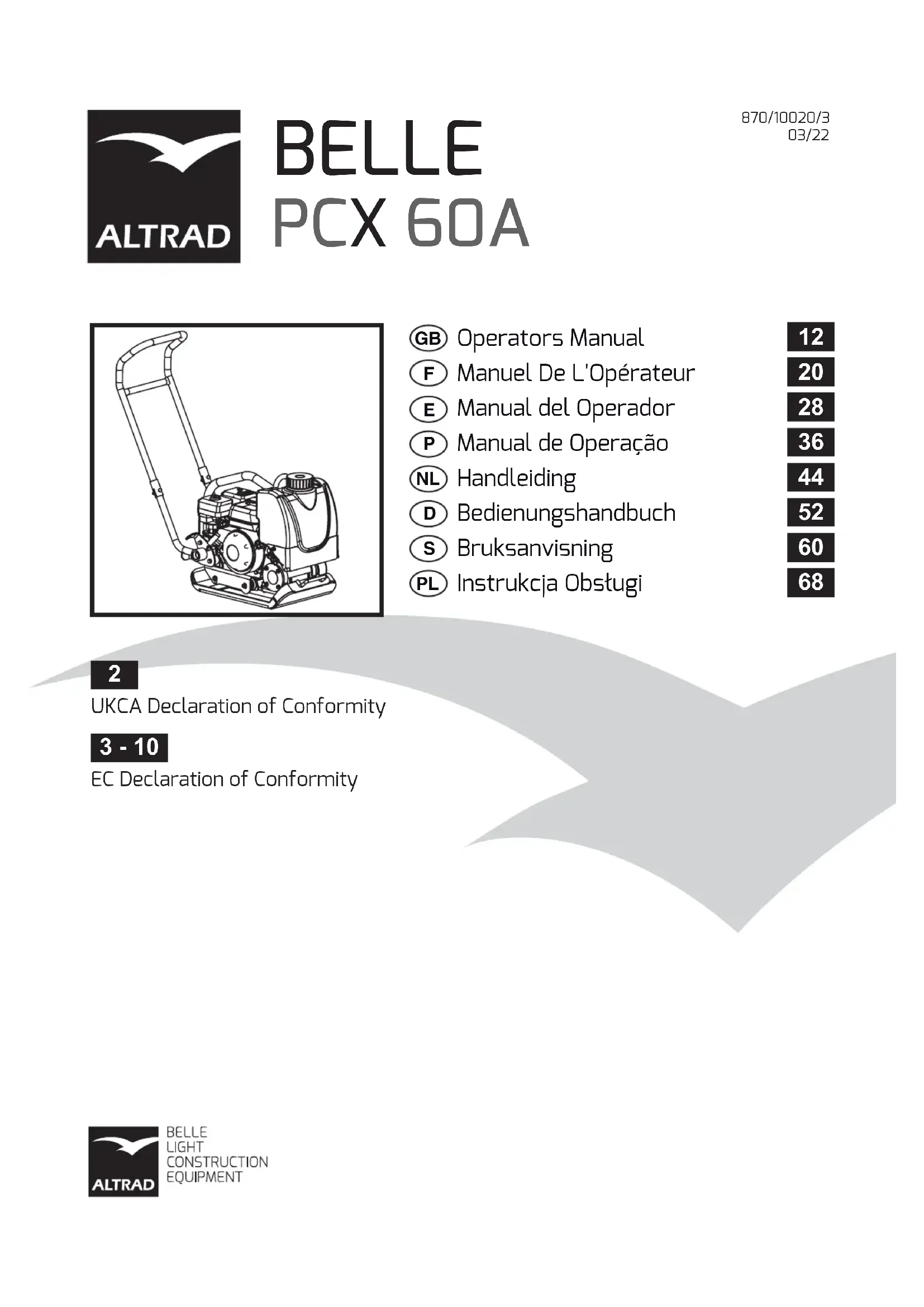Date of Declaration:- April 20214 Déclaration CE de conformité (DdC) Nous, Altrad Belle, Sheen, Nr. Buxton, Derbyshire, SK17 0EU, GB déclarons que la DdC est émisse sous notre seule responsabilité et qu'elle appartient au(x) produit(s) suivants: Directeur GénéralAu nom de Altrad BelleSheen, Derbyshire, R.-U. Ray Neilson Signée par:866/10000/0_F Voir page 3 pour cette information TYPE DE PRODUIT.....................................MODÈLE......................................................No DE SÉRIE...............................................DATE DE FABRICATION.............................NIVEAU DE PUISSANCE ACOUSTIQUEMESURÉ /........................................................................(GARANTI)POIDS .......................................................... Objet de la déclaration: Single-direction plate compactor used for soil compaction on new developments, repairs and maintenance jobs with large aggregates, cohesive material or moist content. L'objet de la déclaration décrite ci-dessus est conforme à la législation de l'Union européenne en matière d'harmonisation: - 2006/42/EC Directive relative aux machines - 2000/14/EC Émissions sonores - matériels utilisés à l'extérieur Les normes et les spécifications techniques harmonisées suivantes ont été appliquées: - EN ISO 12100:2010 Sécurité des machines - EN 500-4:2011 Machines mobiles de construction de routes. Sécurité. - ISO 3744:2010 Acoustique - Détermination des niveaux de puissance acoustique et des niveaux d'énergie acoustique des sources de bruit à l'aide de la pression acoustique VINÇOTTE nv/sa (NB0026) a effectué un contrôle interne de la production avec évaluation de la documentation technique et vérification périodique conformément à l'annexe VI de la directive 2000/14/CE Les dossiers techniques sont détenus par Hugues Menager à l'adresse suivante:- Altrad (Group Holding), 125 Rue du Mas Carbonnier, 34000, Montpellier, France. Lieu de la déclaration:- Sheen, Nr. Buxton, Derbyshire, SK17 0EU,