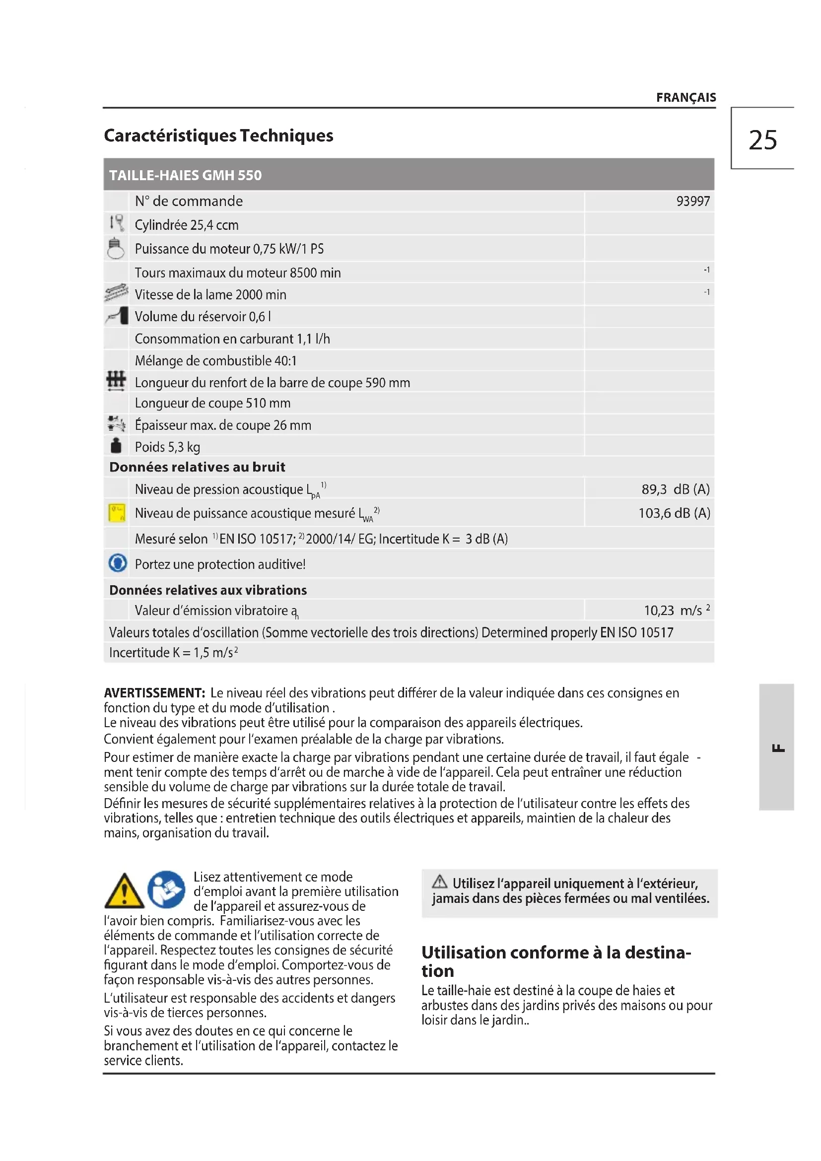 Caractéristiques Techniques TAILLE-HAIES GMH 550 N° de commande