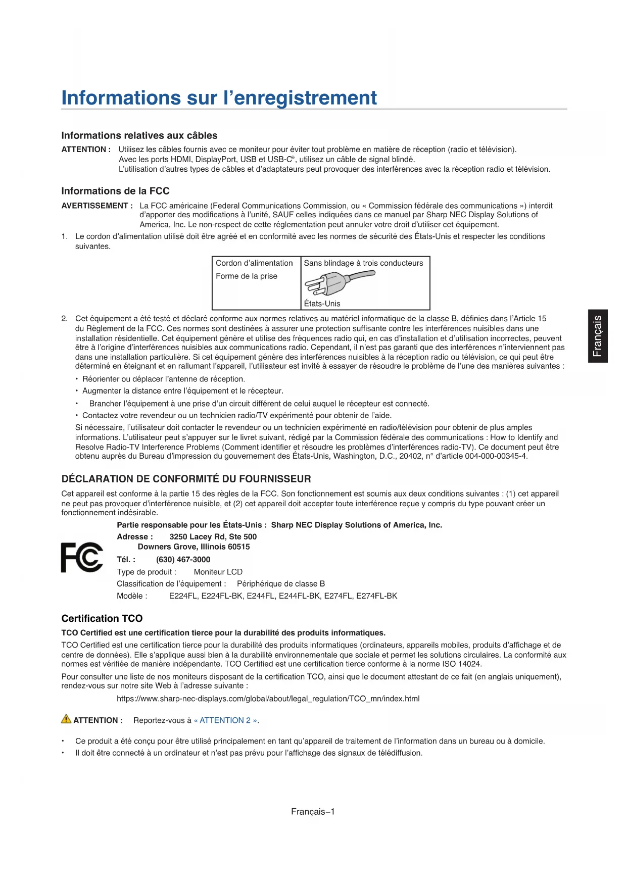 La FCC américaine (Federal Communications Commission, ou « Commission fédérale des communications ») interdit d’apporter des modications à l’unité, SAUF celles indiquées dans ce manuel par Sharp NEC Display Solutions of America, Inc. Le non-respect de cette réglementation peut annuler votre droit d’utiliser cet équipement. 1. Le cordon d’alimentation utilisé doit être agréé et en conformité avec les normes de sécurité des États-Unis et respecter les conditions suivantes. Cordon d’alimentation Forme de la prise Sans blindage à trois conducteurs États-Unis 2. Cet équipement a été testé et déclaré conforme aux normes relatives au matériel informatique de la classe B, dénies dans l’Article 15 du Règlement de la FCC. Ces normes sont destinées à assurer une protection sufsante contre les interférences nuisibles dans une installation résidentielle. Cet équipement génère et utilise des fréquences radio qui, en cas d’installation et d’utilisation incorrectes, peuvent être à l’origine d’interférences nuisibles aux communications radio. Cependant, il n’est pas garanti que des interférences n’interviennent pas dans une installation particulière. Si cet équipement génère des interférences nuisibles à la réception radio ou télévision, ce qui peut être déterminé en éteignant et en rallumant l’appareil, l’utilisateur est invité à essayer de résoudre le problème de l’une des manières suivantes :