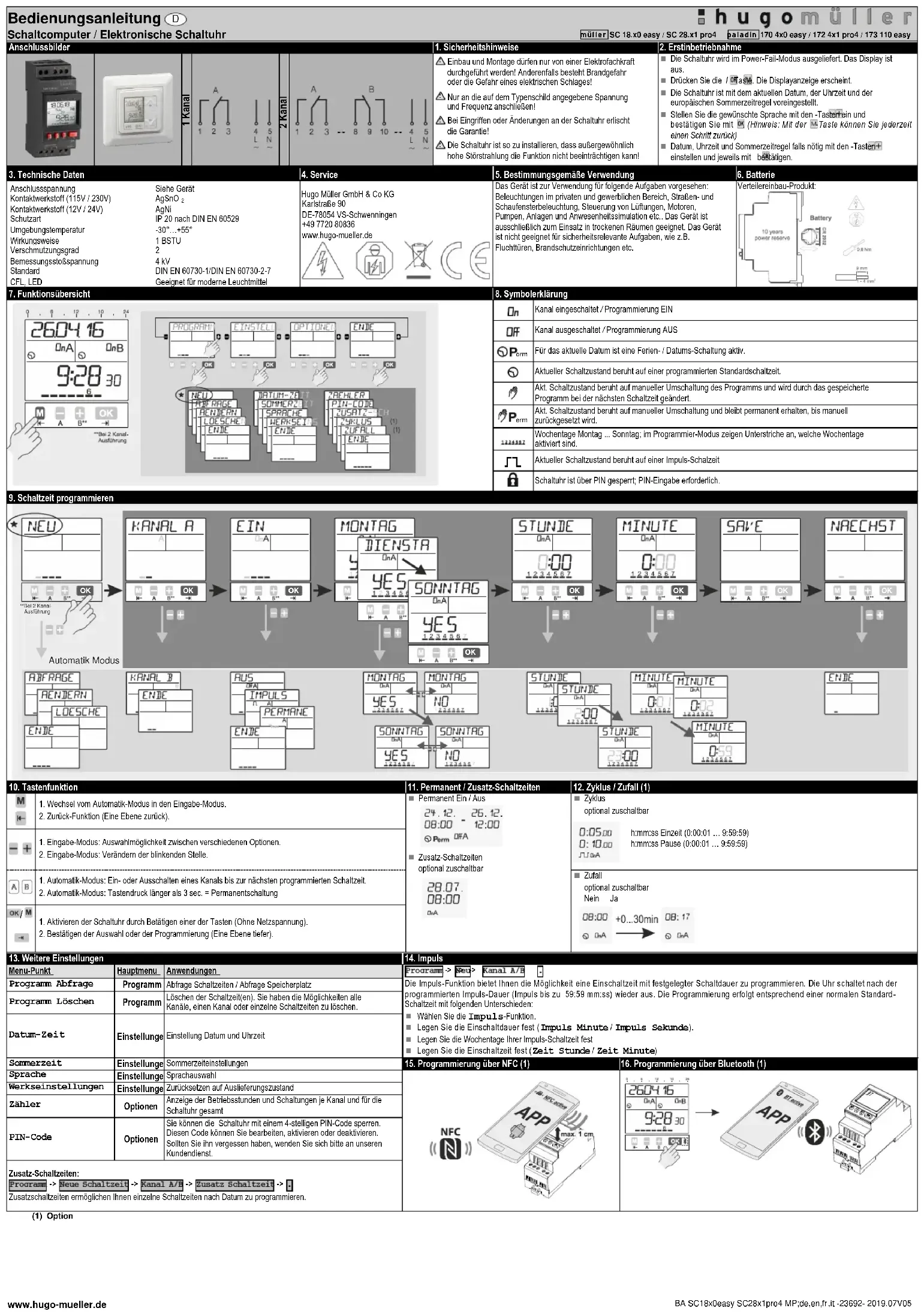 Langage Réglages Choix du langage Réglages usine Réglages Remise à zero, c´est à dire retour à l´état de livraison. Compteur Options Affichage des heures de marche et du nombre de commutations pour chaque canal et affichage du total de l´interrupteur horaire PIN-Code Options L´interrupteur horaire peut être verrouillé grâce à un code PIN de 4 chiffres. Ce code peut être modifié, activé ou désactivé. En cas d´oubli ou de perte de ce code, contacter notre service àprès-vente. Heures de commutation supplémentaires : -> -> -> -> La fonction « heures de commutation supplémentaires » permet de réaliser des commutations uniques affectées à une date.www.hugo-mueller.de BA SC18x0easy SC28x1pro4 MP;de,en,fr,it -23692- 2019.07V05 (1) Opzioni Manuale di istruzione