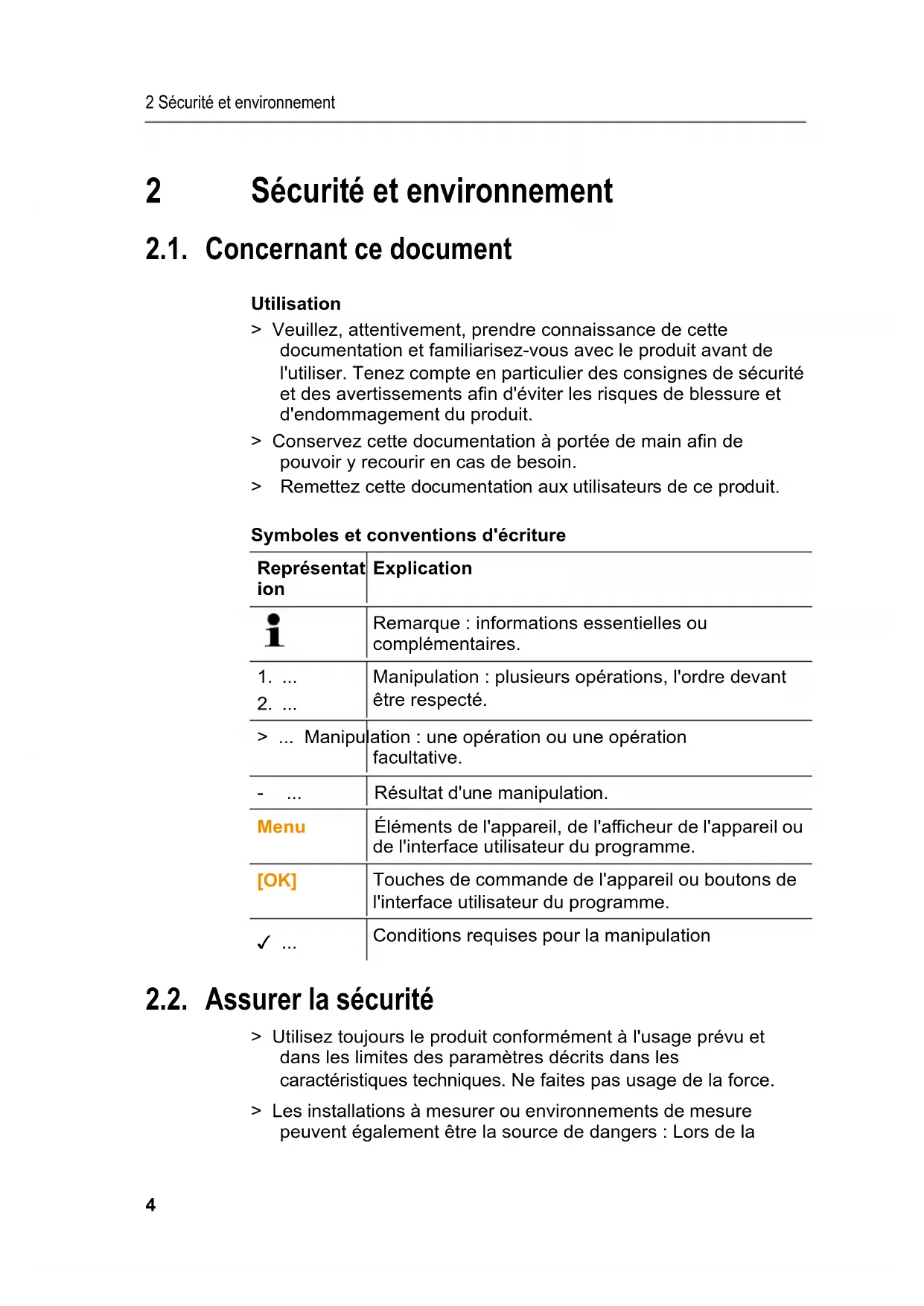 2.2. Assurer la sécurité > Utilisez toujours le produit conformément à l'usage prévu et dans les limites des paramètres décrits dans les caractéristiques techniques. Ne faites pas usage de la force. > Les installations à mesurer ou environnements de mesure peuvent également être la source de dangers : Lors de la2 Sécurité et environnement
