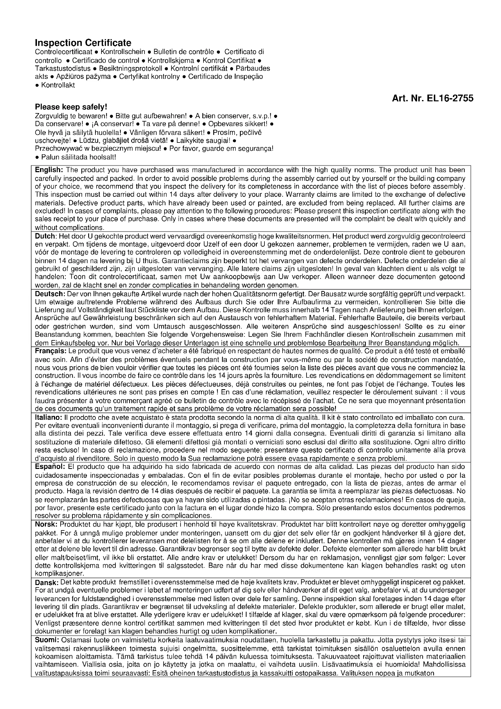 Wir wünschen Ihnen nun viel Spass und Erfolg beim Aufbau und jahrelange Freude mit Ihrem Gartenhaus!Notice de montage – Français 1 Généralités Cher client, Nous sommes heureux que votre choix se soit porté sur notre maison de jardin! Il est important de lire entièrement cette notice de montage avant de commencer la construction de votre maisonnette en poutres! Vous vous éviterez ainsi des problèmes et des pertes de temps inutiles. Conseils: Avant son montage définitif, entreposez le kit de construction au sec et pas directement sur la terre, en le protégeant contre les intempéries (humidité, rayonnement du soleil, etc.). Ne pas conserver la marchandise dans un local chauffé! Au moment de choisir l'endroit de montage, veillez à ce que la maisonnette en poutres ne soit pas exposée à des conditions atmosphériques extrêmes (zones exposées à des vents forts). Le cas échéant, il serait bon d'ancrer la maisonnette en poutres dans des fondations. Garantie Votre maisonnette est réalisée en bois d'épicéa nordique de haute qualité et elle vous est livrée non traitée. Si elle devait donner lieu à des réclamations, malgré les soins apportés à notre contrôle en usine, nous vous demandons de remettre à votre revendeur spécialisé le bon de contrôle rempli et votre facture d'achat! IMPORTANT: Veuillez impérativement conserver la documentation! Vous trouverez sur le bon de contrôle le numéro de contrôle de la maisonnette. La réclamation ne peut être traitée dans le cadre de la garantie que si vous communiquez le numéro de contrôle à votre revendeur spécialisé! Le bois est un produit naturel, ce qui fait que les réclamations reposant sur des phénomènes naturels ne tombent pas sous le coup de la garantie. Ecarts qui ne constituent pas un motif de réclamation: Les réclamations concernant les matériaux ne sont pas acceptées si une peinture a déjà été appliquée! Nœuds qui sont inhérents au bois. Décolorations du bois qui n'exercent pas d'influences sur la durée de vie. Fissures / fentes de retrait qui ne sont pas traversantes et qui n'exercent pas d'influences sur la construction. Déformations du bois, sous réserve qu'il puisse encore être mis en œuvre. Sur les faces non visibles des planches du toit et du plancher, il se peut que les planches ne soient pas rabotées, on peut observer des différences de couleur et des flaches. Une réclamation tardive résultant d'un montage incorrectement réalisé, d'un affaissement de la maisonnette par suite de fondations et de soubassements incorrectement réalisés, est exclue. Une réclamation suite à des modifications apportées de son propre chef à la maisonnette, comme par exemple une déformation des madriers et des fenêtres/portes par suite d'une peinture du bois ou d'une construction insuffisantes, la fixation trop rigide du contreventement, le vissage des dormants sur les madriers, etc., est exclue. Les recours en garantie se limitent au remplacement du matériel défectueux. Tous les autres recours sont exclus!Notice de montage – Français Peinture et entretien Le bois est un produit naturel qui travaille de façon variable. Des caractéristiques telles que les madrures grossières et fines, les nuances de couleurs et les modifications, de même que les imbrications, ont leur origine dans la croissance du bois. Dans le cas de bois qui poussent en pleine nature, ces caractéristiques sont normales et ne doivent par conséquent pas être considérées comme des défauts mais, au contraire, comme une particularité de ce matériau naturel qu'est le bois. Au bout de quelque temps, le bois non traité (à l'exception des longrines) prendra une teinte grise, il pourra bleuir et moisir. Pour protéger votre maisonnette en poutres, il convient que vous le traitiez avec des produits de protection du bois appropriés. Pour protéger votre maison de jardin de façon optimale, nous vous conseillons de traiter préalablement les planches du plancher à l'aide d'un apprêt incolore. En particulier la face inférieure à laquelle vous ne pourrez plus avoir accès après le montage. Ce n'est que de cette façon que l'on empêche l'humidité de pénétrer. Nous conseillons de traiter impérativement les portes et les fenêtres également à l'aide d'un apprêt. Il est très important de peindre en une seule fois aussi bien les faces intérieures que les faces extérieures des portes et des fenêtres! Dans le cas contraire, elles pourront se déformer. Une fois le montage effectué, nous vous conseillons de revêtir l'extérieur (sans le toit) d'un apprêt. Dès que cet apprêt sera sec, vous devrez revêtir votre maison d'un glacis pour bois qui protégera le bois contre l'humidité et le rayonnement ultraviolet. Pour la peinture, n'utilisez qu'un outillage et une peinture de haute qualité, et respectez les consignes de sécurité et de mise en œuvre du fabricant de peintures. Ne peignez jamais en plein soleil ou lorsque le temps est à la pluie. Faites-vous conseiller de façon détaillée par votre revendeur spécialisé quant à la protection à utiliser pour les conifères non traités. En refaisant régulièrement la peinture, vous augmentez sensiblement la durée de vie de votre maison de jardin. Nous vous conseillons également une inspection semestrielle de votre maison de jardin. 2 Préparation au montage Outils et préparation des détails Pour le montage, vous avez besoin du matériel suivant: une personne pour vous aider au montage niveau à bulle d'air couteau echelle double tournevis mètre-ruban