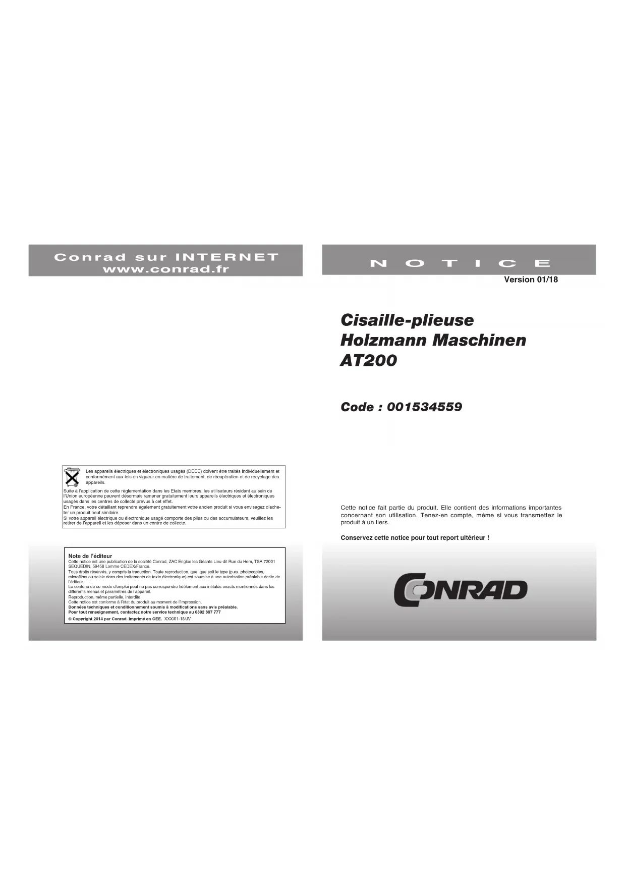 Cisaille-plieuse Holzmann Maschinen AT200 Code : 001534559 Cette notice fait partie du produit. Elle contient des informations importantes concernant son utilisation. Tenez-en compte, même si vous transmettez le produit à un tiers. Conservez cette notice pour tout report ultérieur ! NOTICE Conrad sur INTERNET www.conrad.fr Version 01/18 Les appareils électriques et électroniques usagés (DEEE) doivent être traités individuellement et conformément aux lois en vigueur en matière de traitement, de récupération et de recyclage des appareils.Suite à l’application de cette réglementation dans les Etats membres, les utilisateurs résidant au sein de l’Union européenne peuvent désormais ramener gratuitement leurs appareils électriques et électroniques usagés dans les centres de collecte prévus à cet effet. En France, votre détaillant reprendra également gratuitement votre ancien produit si vous envisagez d’ache- ter un produit neuf similaire.Si votre appareil électrique ou électronique usagé comporte des piles ou des accumulateurs, veuillez les retirer de l’appareil et les déposer dans un centre de collecte.Note de l’éditeurCette notice est une publication de la société Conrad, ZAC Englos les Géants Lieu-dit Rue du Hem, TSA 72001 SEQUEDIN, 59458 Lomme CEDEX/France.Tous droits réservés, y compris la traduction. Toute reproduction, quel que soit le type (p.ex. photocopies, microfilms ou saisie dans des traitements de texte électronique) est soumise à une autorisation préalable écrite de l’éditeur.Le contenu de ce mode d'emploi peut ne pas correspondre fidèlement aux intitulés exacts mentionnés dans les différents menus et paramètres de l'appareil.Reproduction, même partielle, interdite.Cette notice est conforme à l’état du produit au moment de l’impression.Données techniques et conditionnement soumis à modifications sans avis préalable.Pour tout renseignement, contactez notre service technique au 0892 897 777 © Copyright 2014 par Conrad. Imprimé en CEE. XXX/01-18/JV2 7