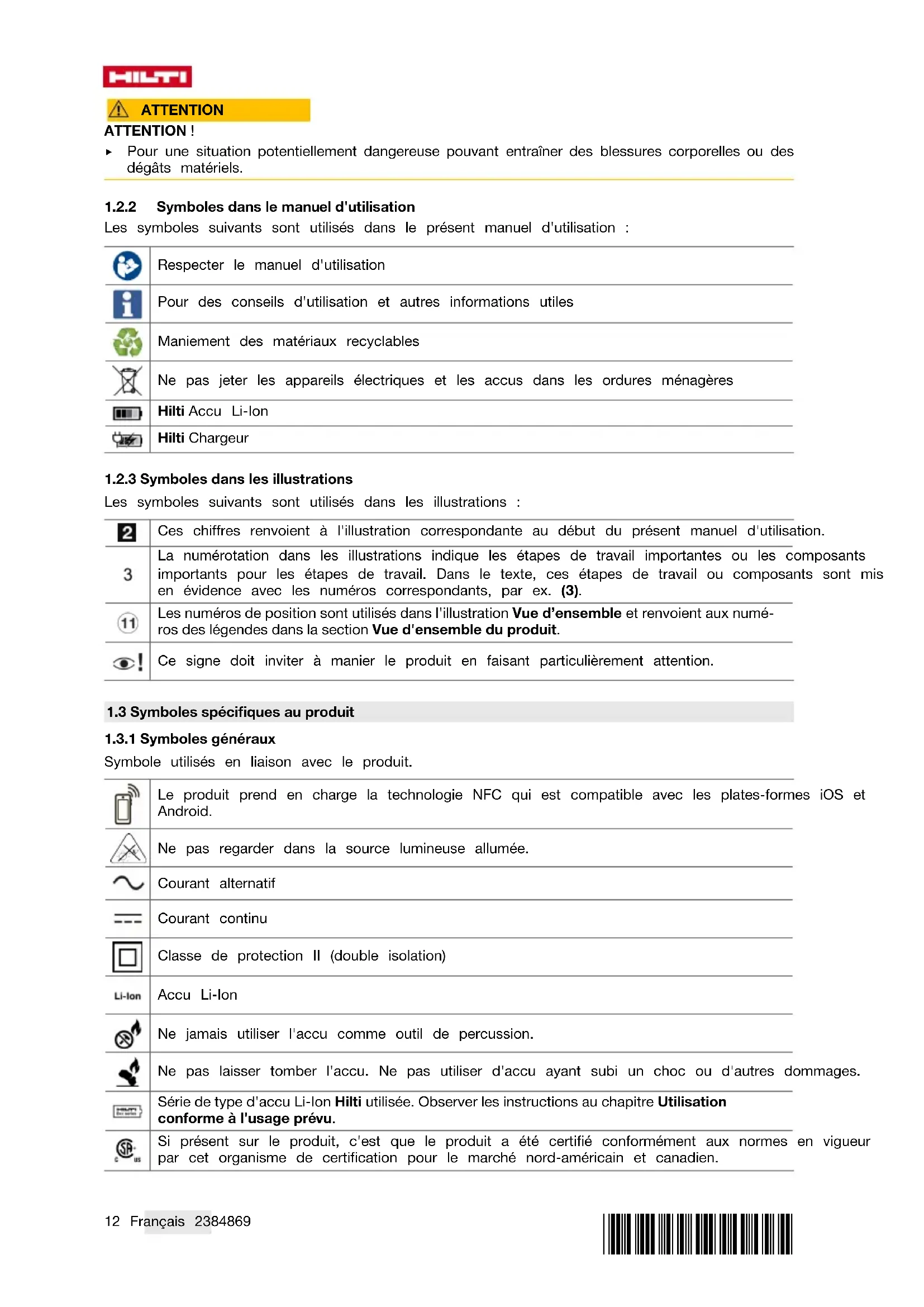 Symbole utilisés en liaison avec le produit. Le produit prend en charge la technologie NFC qui est compatible avec les plates-formes iOS et Android. Ne pas regarder dans la source lumineuse allumée. Courant alternatif Courant continu Classe de protection II (double isolation) Accu Li-Ion Ne jamais utiliser l'accu comme outil de percussion. Ne pas laisser tomber l'accu. Ne pas utiliser d'accu ayant subi un choc ou d'autres dommages. Série de type d'accu Li-Ion Hilti utilisée. Observer les instructions au chapitre Utilisation conforme à l'usage prévu. Si présent sur le produit, c'est que le produit a été certifié conformément aux normes en vigueur par cet organisme de certification pour le marché nord-américain et canadien.*2384869* 2384869 Français 13