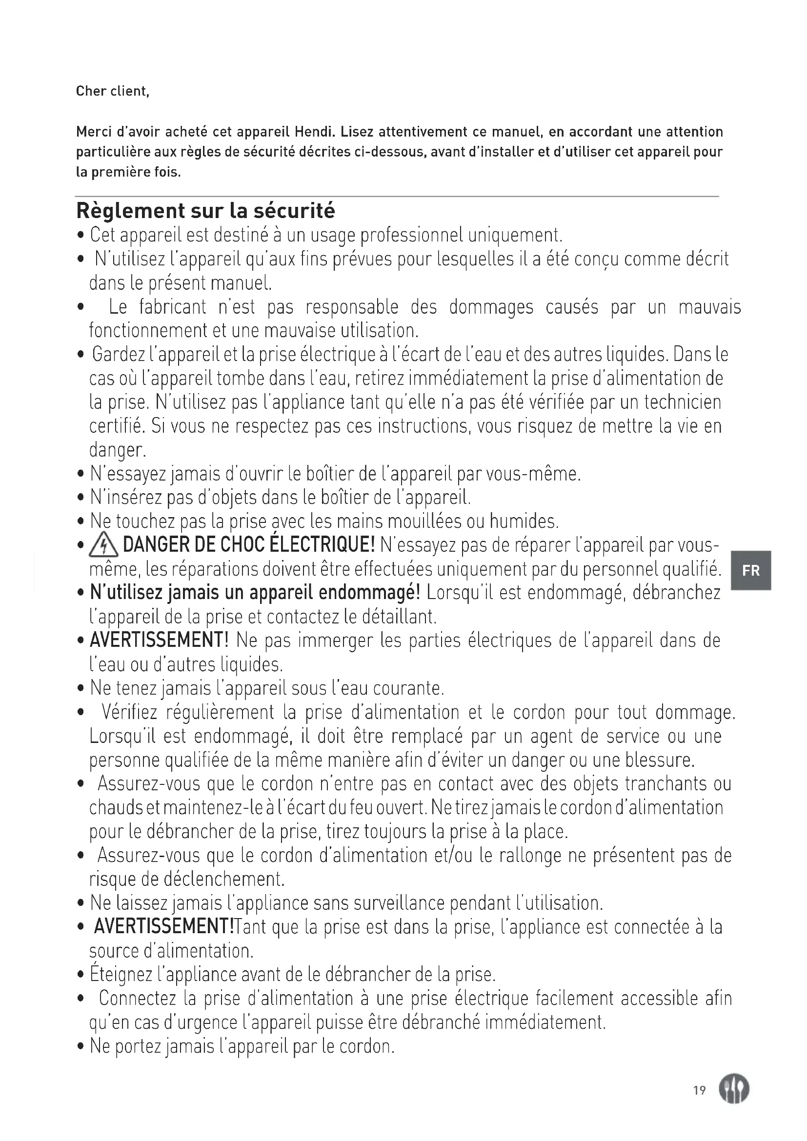 Cher client, Merci d’avoir acheté cet appareil Hendi. Lisez attentivement ce manuel, en accordant une attention particulière aux règles de sécurité décrites ci-dessous, avant d’installer et d’utiliser cet appareil pour la première fois. Règlement sur la sécurité