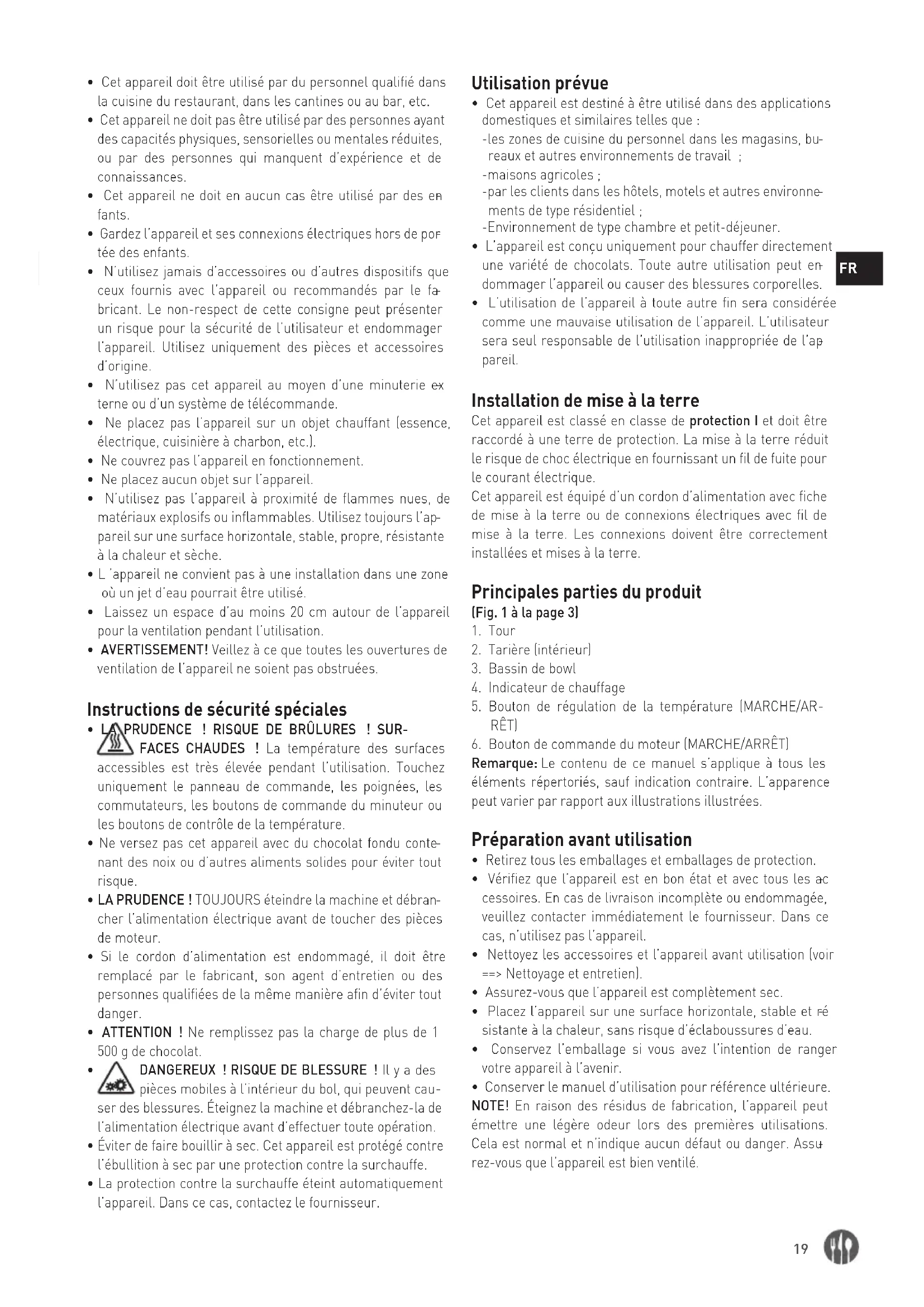 - L’appareil est conçu uniquement pour chauffer directement une variété de chocolats. Toute autre utilisation peut en