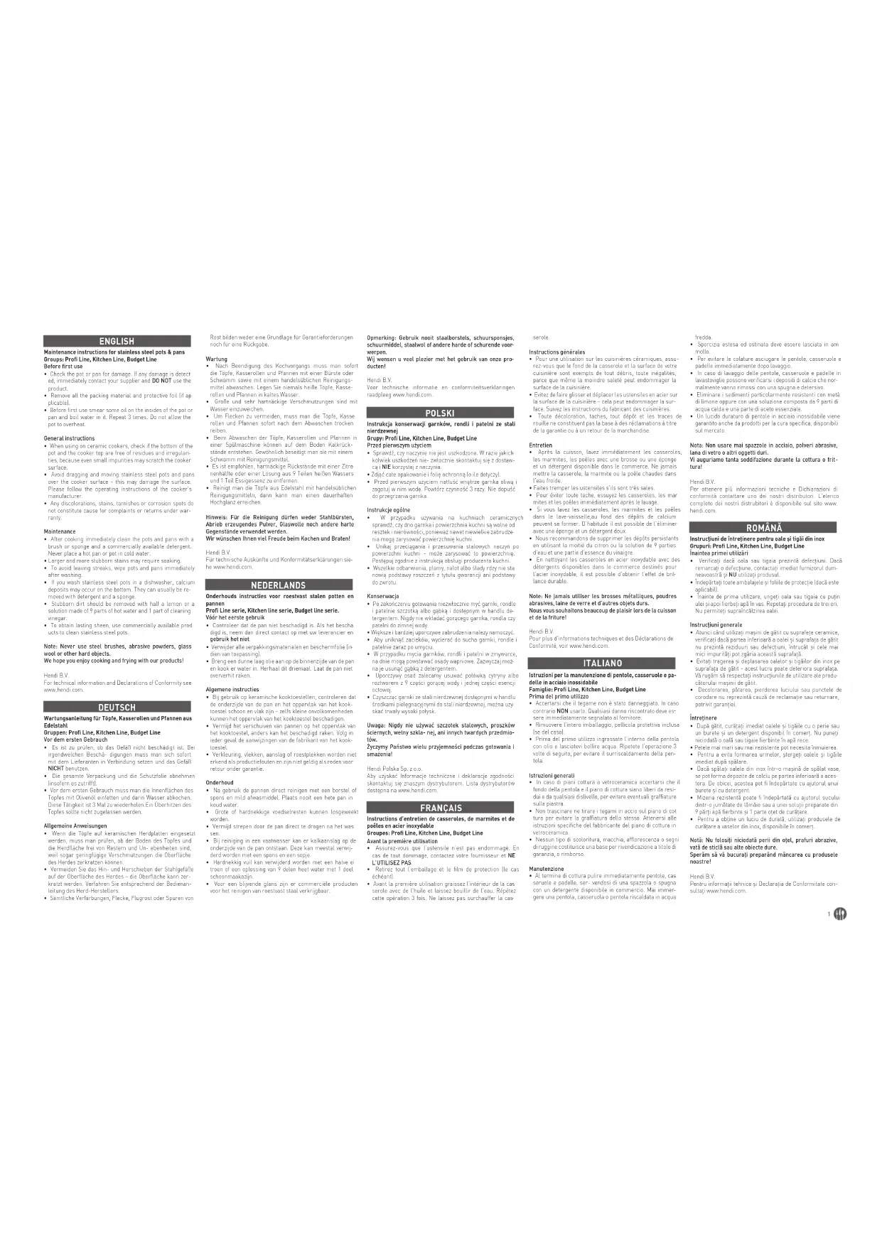 lance durable. Note: Ne jamais utiliser les brosses métalliques, poudres abrasives, laine de verre et d’autres objets durs. Nous vous souhaitons beaucoup de plaisir lors de la cuisson et de la friture! Hendi B.V. Pour plus d’informations techniques et des Déclarations de Conformité, voir www.hendi.com. ITALIANO Istruzioni per la manutenzione di pentole, casseruole e pa- delle in acciaio inossidabile Famiglie: Profi Line, Kitchen Line, Budget Line Prima del primo utilizzo