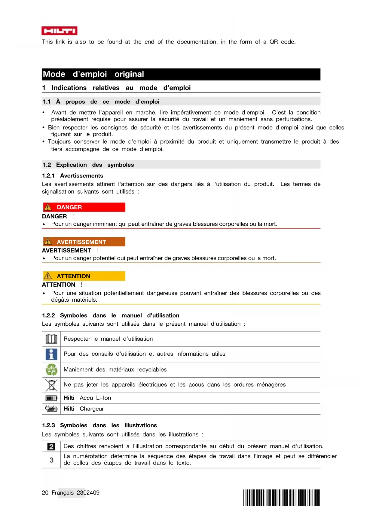 - Page 35 Lire les remarques relatives à la sécurité et à l'utilisation des accus LiIon Hilti que vous trouverez en scannant le code QR à la fin de ce mode d'emploi.*2302409* 2302409 Français 25 3 Description