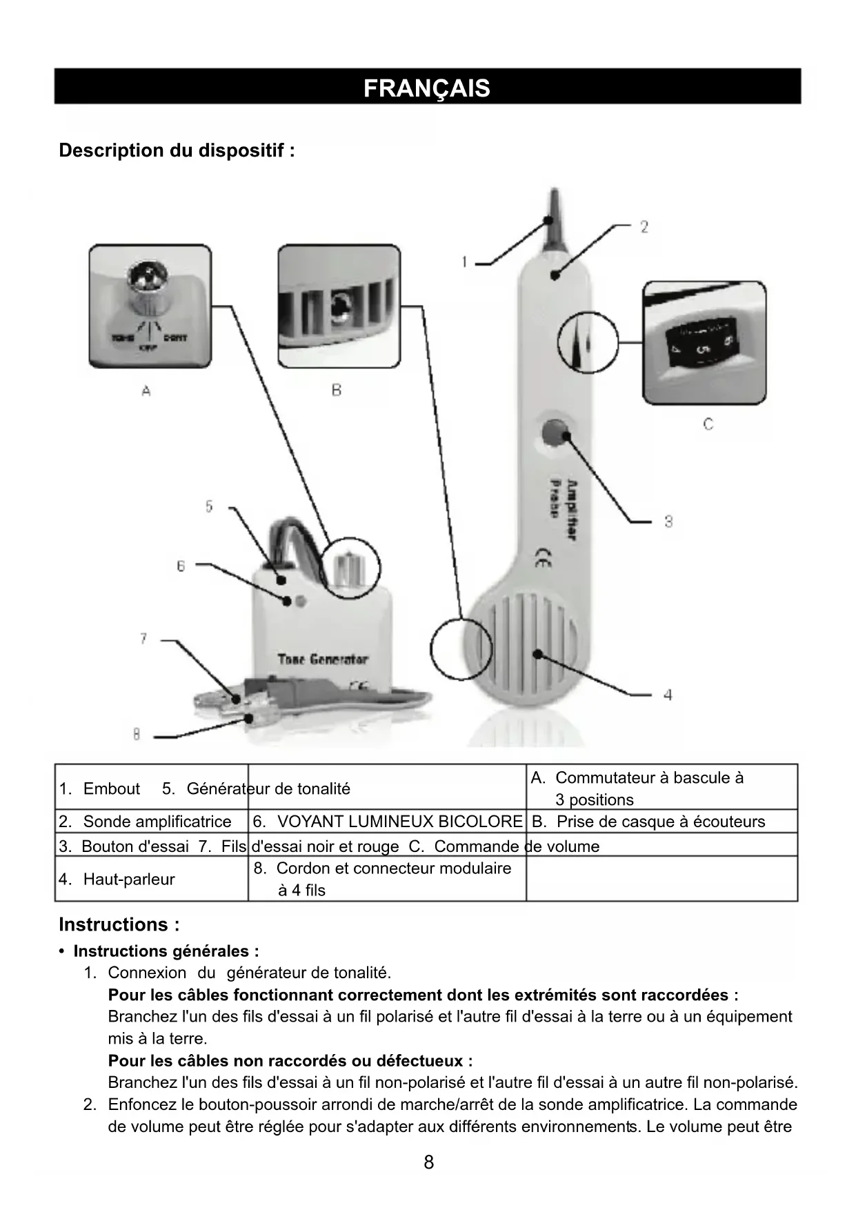 - Pour plus d'informations, contactez le distributeur ou l'autorité locale responsable de la gestion des déchets.11 NEDERLANDS Toongenerator en sonde Uitleg van het apparaat: