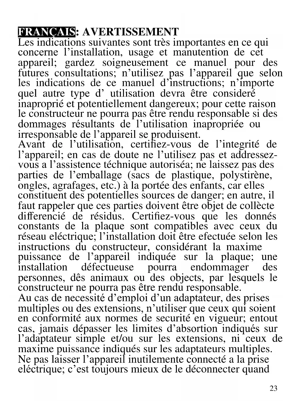 Les indications suivantes sont très importantes en ce qui concerne l’installation, usage et manutention de cet appareil; gardez soigneusement ce manuel pour des futures consultations; n’utilisez pas l’appareil que selon les indications de ce manuel d’instructions; n’importe quel autre type d’ utilisation devra être consideré inaproprié et potentiellement dangereux; pour cette raison le constructeur ne pourra pas être rendu responsable si des dommages résultants de l’utilisation inapropriée ou irresponsable de l’appareil se produisent. Avant de l’utilisation, certifiez-vous de l’integrité de l’appareil; en cas de doute ne l’utilisez pas et addressez- vous a l’assistence téchnique autoriséa; ne laissez pas des parties de l’emballage (sacs de plastique, polystirène, ongles, agrafages, etc.) à la portée des enfants, car elles constituent des potentielles sources de danger; en autre, il faut rappeler que ces parties doivent être objet de collècte differencié de résidus. Certifiez-vous que les donnés constants de la plaque sont compatibles avec ceux du réseau eléctrique; l’installation doit être efectuée selon les instructions du constructeur, considérant la maxime puissance de l’appareil indiquée sur la plaque; une installation défectueuse pourra endommager des personnes, dês animaux ou des objects, par lesquels le constructeur ne pourra pas être rendu responsable. Au cas de necessité d’emploi d’un adaptateur, des prises multiples ou des extensions, n’utiliser que ceux qui soient en conformité aux normes de securité en vigueur; entout cas, jamais dépasser les limites d’absortion indiqués sur l’adaptateur simple et/ou sur les extensions, ni ceux de maxime puissance indiqués sur les adaptateurs multiples. Ne pas laisser l’appareil inutilemente connecté a la prise eléctrique; c’est toujours mieux de le déconnecter quand24 il n’est pas à l’use. Débranchez toujours l'appareil de l'alimentation électrique s'il est laissé sans surveillance. Pour le nettoyage déconnectez la fiche du secteur électrique. Quand l’appareil soit hors usage et ait été décidé qu’il ne sera pas reparé, on reccomande son inutilisation, en coupant son câble d’alimentation. - Ne pas approcher le câble d’alimentation d’objects coupants ou de surfaces chaudes, et ne pas tirer sur le cordon d’alimentation pour le débrancher de la prise. Ne le laissez pas pendre du plan de travail où un enfant pourrait le tenir. - Ne pas utiliser l’appareil si le câble d’alimentation ou la fiche de connéction eléctrique sont endommagés, ou encore en cas de court-circuits; dans ce cas là, apporter l’appareil a un centre d’assistence autorisé. - L’appareil n’est pas indiqué pour être exposé à des conditions météorologiques défavorables (pluie, vent, humidité, la glace, etc.); Gardez-le dans un endroit sec. Jamais opérer ou même toucher l’appareil avec les mains mouillées ou les pieds nus. - Cet appareil peut être utilisé par des enfants agés de plus de 8 ans et par des personnes avec une réduite capacité phisique, sensorial ou mental, ou encore avec peu d’expérience à son usage, pourvu qu’une supervision adéquate leur en soit assuré, ou s’ils auraient été instruits à l’usage de l’appareil en complete securité. Les opérations de nettoyage e de manutention ne oivent pás être efectués par des enfants, sauf pour ceux qui sont agés de plus de 8 ans et sont supervisionés. - Les enfants ne doivent pas jouer avec cet appareil. - Gardez l’appareil et le câble d’alimentation hors la portée des enfants agés de moins de 8 ans. Si le câble d'alimentation est endommagé ou en cas de panne et / ou de dysfonctionnement, ne modifiez pas25 l'appareil. Toute réparation doit être effectuée par le fabricant ou par son service d'assistance technique ou, en tout cas, par une personne possédant une qualification similaire, afin d'éviter tout risque. Le non-respect de ce qui précède peut compromettre la sécurité de l'appareil et invalider les conditions de la garantie. - N’utiliser que des accéssoires e pièces d’origine. - Cet appareil est destiné à être utilisé dans les ménages et des applications similaires: les cuisines du personnel dans les magasins, bureaux et autres environnements de travail, pour les clients dans les hôtels, motels et autres environnements de type résidentiel, de type lit et petit- déjeuner, hébergement. - L’appareil n’est pas conçu pour être utilisé avec une minuterie extérieure ou un commande à distance. Avant chaque utilisation, effectuez le cordon d'alimentation. Ne soumettez pas le produit à des chocs susceptibles de l'endommager.
