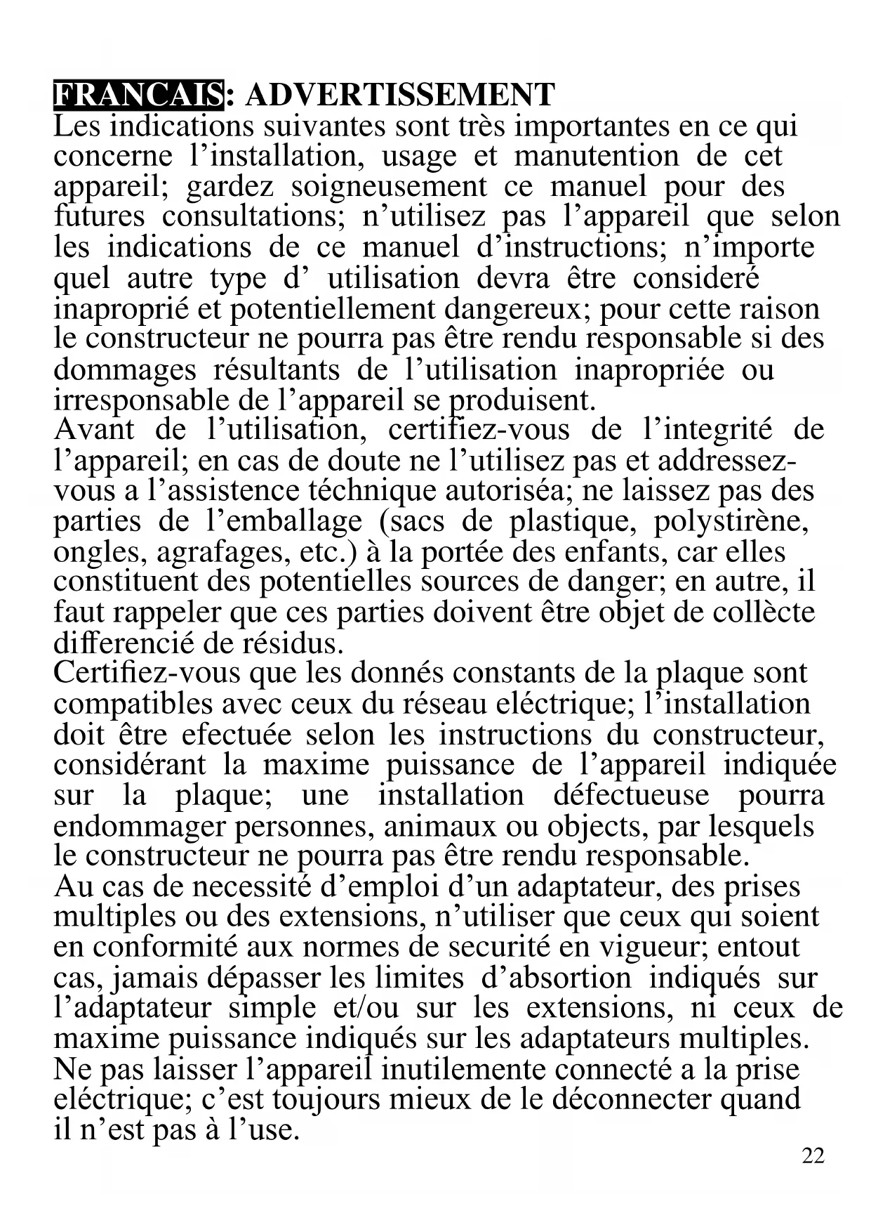 W22 FRANCAIS: ADVERTISSEMENT Les indications suivantes sont très importantes en ce qui concerne l’installation, usage et manutention de cet appareil; gardez soigneusement ce manuel pour des futures consultations; n’utilisez pas l’appareil que selon les indications de ce manuel d’instructions; n’importe quel autre type d’ utilisation devra être consideré inaproprié et potentiellement dangereux; pour cette raison le constructeur ne pourra pas être rendu responsable si des dommages résultants de l’utilisation inapropriée ou irresponsable de l’appareil se produisent. Avant de l’utilisation, certifiez-vous de l’integrité de l’appareil; en cas de doute ne l’utilisez pas et addressez- vous a l’assistence téchnique autoriséa; ne laissez pas des parties de l’emballage (sacs de plastique, polystirène, ongles, agrafages, etc.) à la portée des enfants, car elles constituent des potentielles sources de danger; en autre, il faut rappeler que ces parties doivent être objet de collècte differencié de résidus. Certifiez-vous que les donnés constants de la plaque sont compatibles avec ceux du réseau eléctrique; l’installation doit être efectuée selon les instructions du constructeur, considérant la maxime puissance de l’appareil indiquée sur la plaque; une installation défectueuse pourra endommager personnes, animaux ou objects, par lesquels le constructeur ne pourra pas être rendu responsable. Au cas de necessité d’emploi d’un adaptateur, des prises multiples ou des extensions, n’utiliser que ceux qui soient en conformité aux normes de securité en vigueur; entout cas, jamais dépasser les limites d’absortion indiqués sur l’adaptateur simple et/ou sur les extensions, ni ceux de maxime puissance indiqués sur les adaptateurs multiples. Ne pas laisser l’appareil inutilemente connecté a la prise eléctrique; c’est toujours mieux de le déconnecter quand il n’est pas à l’use.23 Débranchez toujours l'appareil de l'alimentation électrique s'il est laissé sans surveillance. Pour le nettoyage déconnectez la fiche du secteur électrique. Quand l’appareil soit hors usage et ait été décidé qu’il ne sera pas reparé, on reccomande son inutilisation, en coupant son câble d’alimentation. - Ne pas approcher le câble d’alimentation d’objects coupants ou de surfaces chaudes, et ne pas tirer sur le cordon d’alimentation pour le débrancher de la prise. Ne le laissez pas pendre du plan de travail où un enfant pourrait le tenir. - Ne pas utiliser l’appareil si le câble d’alimentation ou la fiche de connéction eléctrique sont endommagés, ou encore en cas de court-circuits; dans ce cas là, apporter l’appareil a un centre d’assistence autorisé. - L’appareil n’est pas indiqué pour être exposé à des conditions météorologiques défavorables (pluie, vent, humidité, la glace, etc.); Gardez-le dans un endroit sec. Jamais opérer ou même toucher l’appareil avec les mains mouillées ou les pieds nus. - Cet appareil peut être utilisé par des enfants agés de plus de 8 ans et par des personnes avec une réduite capacité phisique, sensorial ou mental, ou encore avec peu d’expérience à son usage, pourvu qu’une supervision adéquate leur en soit assuré, ou s’ils auraient été instruits à l’usage de l’appareil en complete securité. Les opérations de nettoyage e de manutention ne oivent pás être efectués par des enfants, sauf pour ceux qui sont agés de plus de 8 ans et sont supervisionés. - Les enfants ne doivent pas jouer avec cet appareil. - Gardez l’appareil et le câble d’alimentation hors la portée des enfants agés de moins de 8 ans. Si le câble d'alimentation est endommagé ou en cas de panne et / ou de dysfonctionnement, ne modifiez pas l'appareil. Toute réparation doit être effectuée par le24 fabricant ou par son service d'assistance technique ou, en tout cas, par une personne possédant une qualification similaire, afin d'éviter tout risque. Le non-respect de ce qui précède peut compromettre la sécurité de l'appareil et invalider les conditions de la garantie. - Cet appareil est destiné à être utilisé dans les ménages et des applications similaires: les cuisines du personnel dans les magasins, bureaux et autres environnements de travail, pour les clients dans les hôtels, motels et autres environnements de type résidentiel, de type lit et petit- déjeuner, hébergement. - L’appareil n’est pas conçu pour être utilisé avec une minuterie extérieure ou un commande à distance. - N’utiliser que des accéssoires e pièces d’origine. - Avant chaque utilisation, effectuez le cordon d'alimentation. Ne soumettez pas le produit à des chocs susceptibles de l'endommager. Tenir l’appareil à l’écart des environnements où il peut y avoir des gaz, vapeurs, des substances inflammables ou explosives.