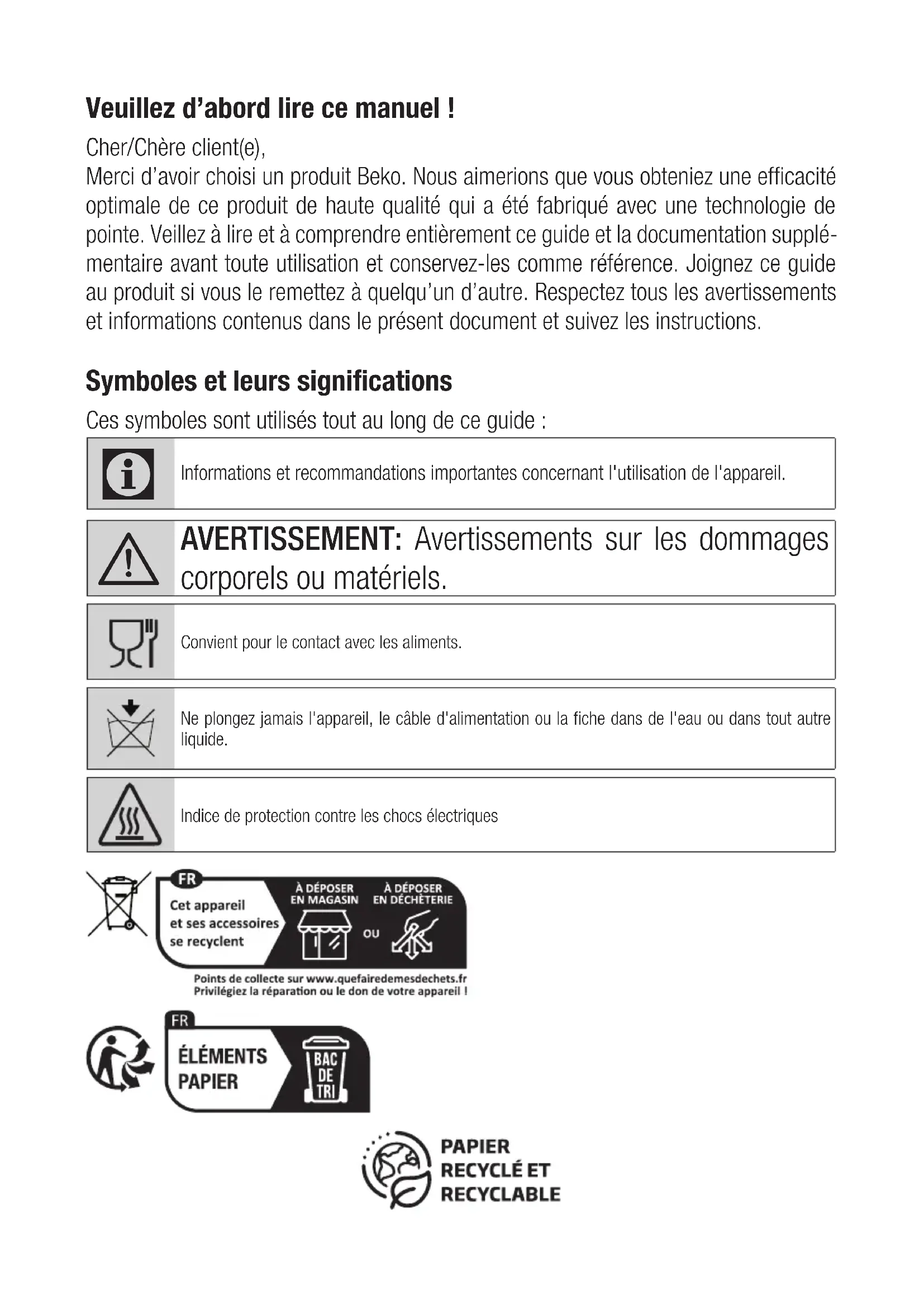 Diese Garantiezusage ist nur gültig innerhalb der Bundesrepublik Deutschland Garantiebedingungen - Beko – Version Februar 2021Veuillez d’abord lire ce manuel ! Cher/Chère client(e), Merci d’avoir choisi un produit Beko. Nous aimerions que vous obteniez une efficacité optimale de ce produit de haute qualité qui a été fabriqué avec une technologie de pointe. Veillez à lire et à comprendre entièrement ce guide et la documentation supplé- mentaire avant toute utilisation et conservez-les comme référence. Joignez ce guide au produit si vous le remettez à quelqu’un d’autre. Respectez tous les avertissements et informations contenus dans le présent document et suivez les instructions. Symboles et leurs significations Ces symboles sont utilisés tout au long de ce guide :