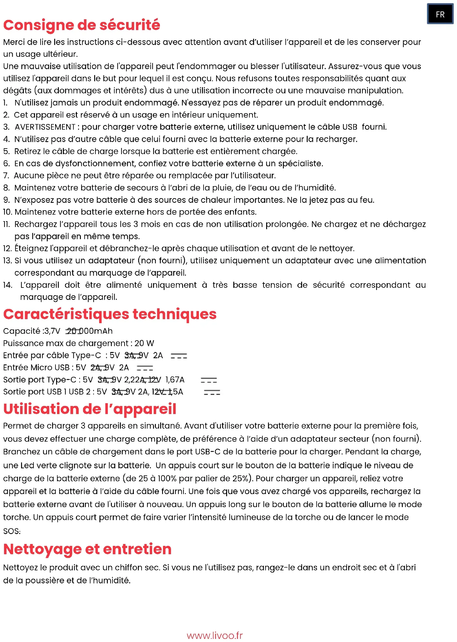 marquage de l’appareil. Caractéristiques techniques Capacité :3,7V 20 000mAh Puissance max de chargement : 20 W Entrée par câble Type-C : 5V 3A, 9V 2A Entrée Micro USB : 5V 2A, 9V 2A Sortie port Type-C : 5V 3A, 9V 2,22A, 12V 1,67A Sortie port USB 1 USB 2 : 5V 3A, 9V 2A, 12V 1,5A Utilisation de l’appareil Permet de charger 3 appareils en simultané. Avant d'utiliser votre batterie externe pour la première fois, vous devez effectuer une charge complète, de préférence à l’aide d’un adaptateur secteur (non fourni). Branchez un câble de chargement dans le port USB-C de la batterie pour la charger. Pendant la charge, une Led verte clignote sur la batterie. Un appuis court sur le bouton de la batterie indique le niveau de charge de la batterie externe (de 25 à 100% par palier de 25%). Pour charger un appareil, reliez votre appareil et la batterie à l’aide du câble fourni. Une fois que vous avez chargé vos appareils, rechargez la batterie externe avant de l'utiliser à nouveau. Un appuis long sur le bouton de la batterie allume le mode torche. Un appuis court permet de faire varier l’intensité lumineuse de la torche ou de lancer le mode SOS. Nettoyage et entretien Nettoyez le produit avec un chiffon sec. Si vous ne l'utilisez pas, rangez-le dans un endroit sec et à l'abri de la poussière et de l’humidité.