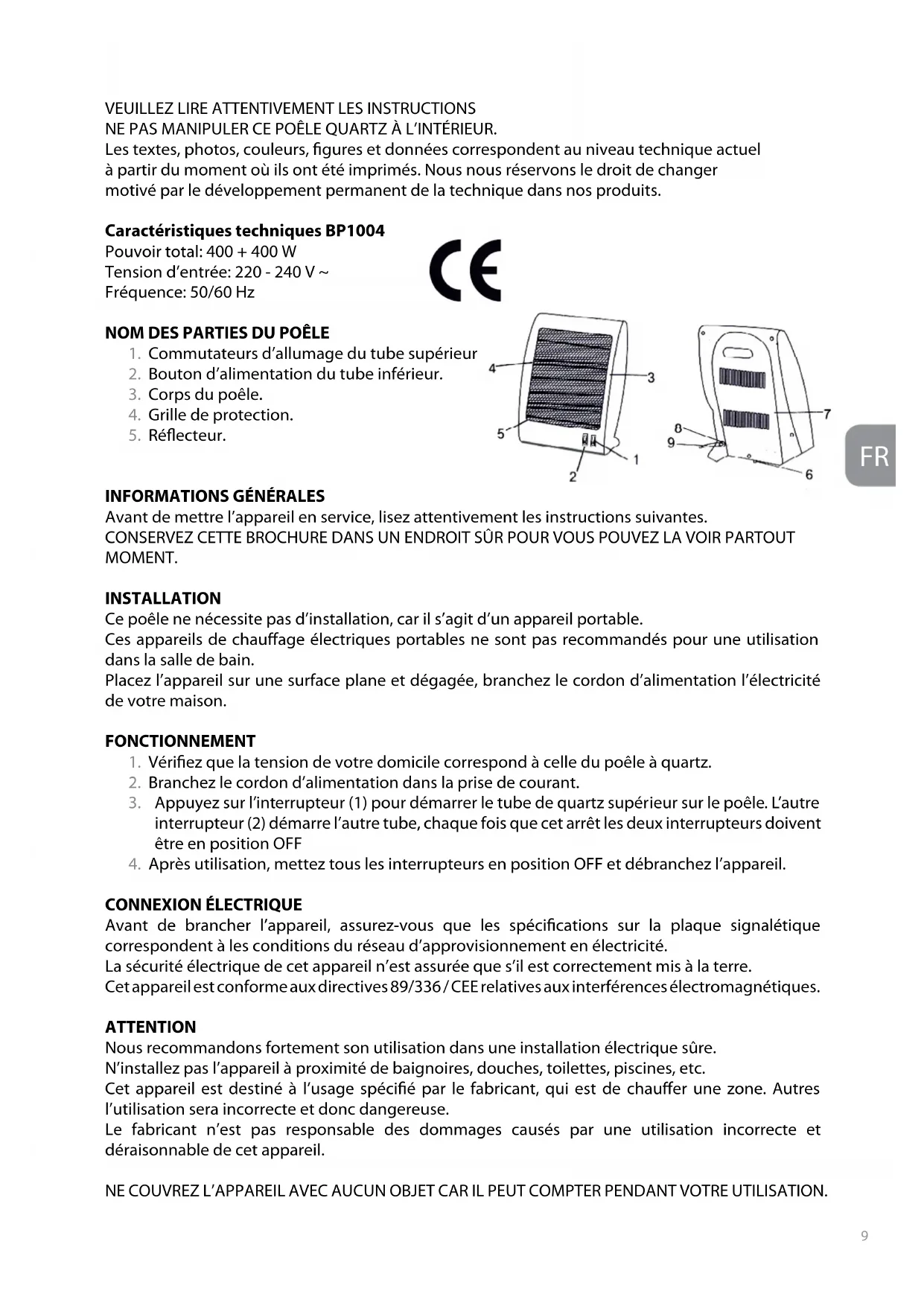 NE PAS MANIPULER CE POÊLE QUARTZ À L’INTÉRIEUR. Les textes, photos, couleurs, gures et données correspondent au niveau technique actuel à partir du moment où ils ont été imprimés. Nous nous réservons le droit de changer motivé par le développement permanent de la technique dans nos produits. Caractéristiques techniques BP1004 Pouvoir total: 400 + 400 W Tension d’entrée: 220 - 240 V ~ Fréquence: 50/60 Hz