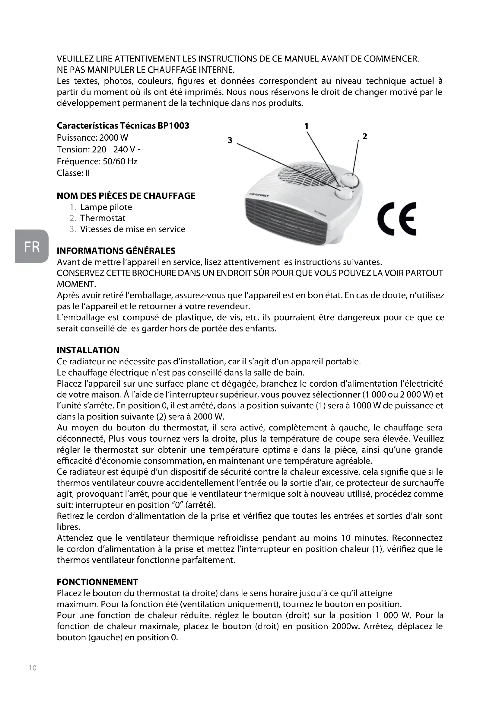 VEUILLEZ LIRE ATTENTIVEMENT LES INSTRUCTIONS DE CE MANUEL AVANT DE COMMENCER. NE PAS MANIPULER LE CHAUFFAGE INTERNE. Les textes, photos, couleurs, gures et données correspondent au niveau technique actuel à partir du moment où ils ont été imprimés. Nous nous réservons le droit de changer motivé par le développement permanent de la technique dans nos produits. Características Técnicas BP1003 Puissance: 2000 W Tension: 220 - 240 V ~ Fréquence: 50/60 Hz Classe: II