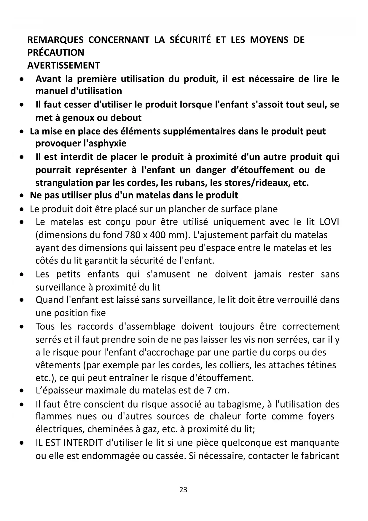 - Le matelas est conçu pour être utilisé uniquement avec le lit LOVI (dimensions du fond 780 x 400 mm). L'ajustement parfait du matelas ayant des dimensions qui laissent peu d'espace entre le matelas et les côtés du lit garantit la sécurité de l'enfant.
